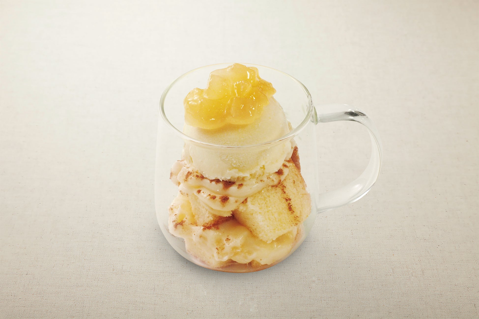 スフレに、りんごクリーム、バニラアイス、りんごソースを入れて、味のアクセントにシナモンを振りかけ、ミニパフェ仕立てにしました。