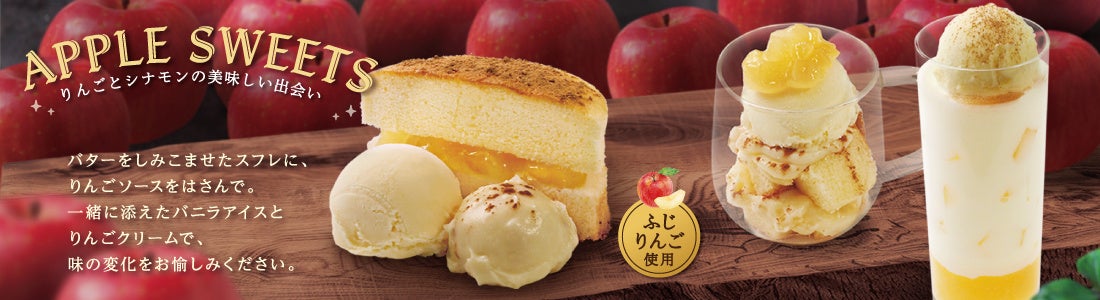 特に注目商品の「ふじりんごのスフレ」は、甘酸っぱいりんごソースをバターがしみ込んだスフレで挟み、一緒に添えたバニラアイスとりんごクリームによって、多彩な味わいを感じていただける仕立てにしております。その他にも食後に最適なサイズの「ミニりんごパフェ」やりんごのシャキシャキ感がアクセントの「ふじりんごフロート」と様々な仕立で、この時期限定のりんごスイーツをお愉しみいただけます。