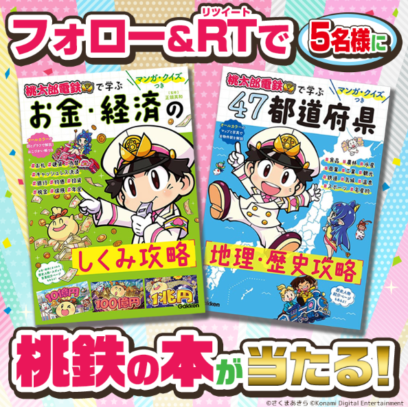 「桃太郎電鉄」公式Twitterアカウントにて『47都道府県 地理・歴史攻略』『お金・経済のしくみ攻略』2冊セットが抽選で当たるプレゼントキャンペーンを実施中です。