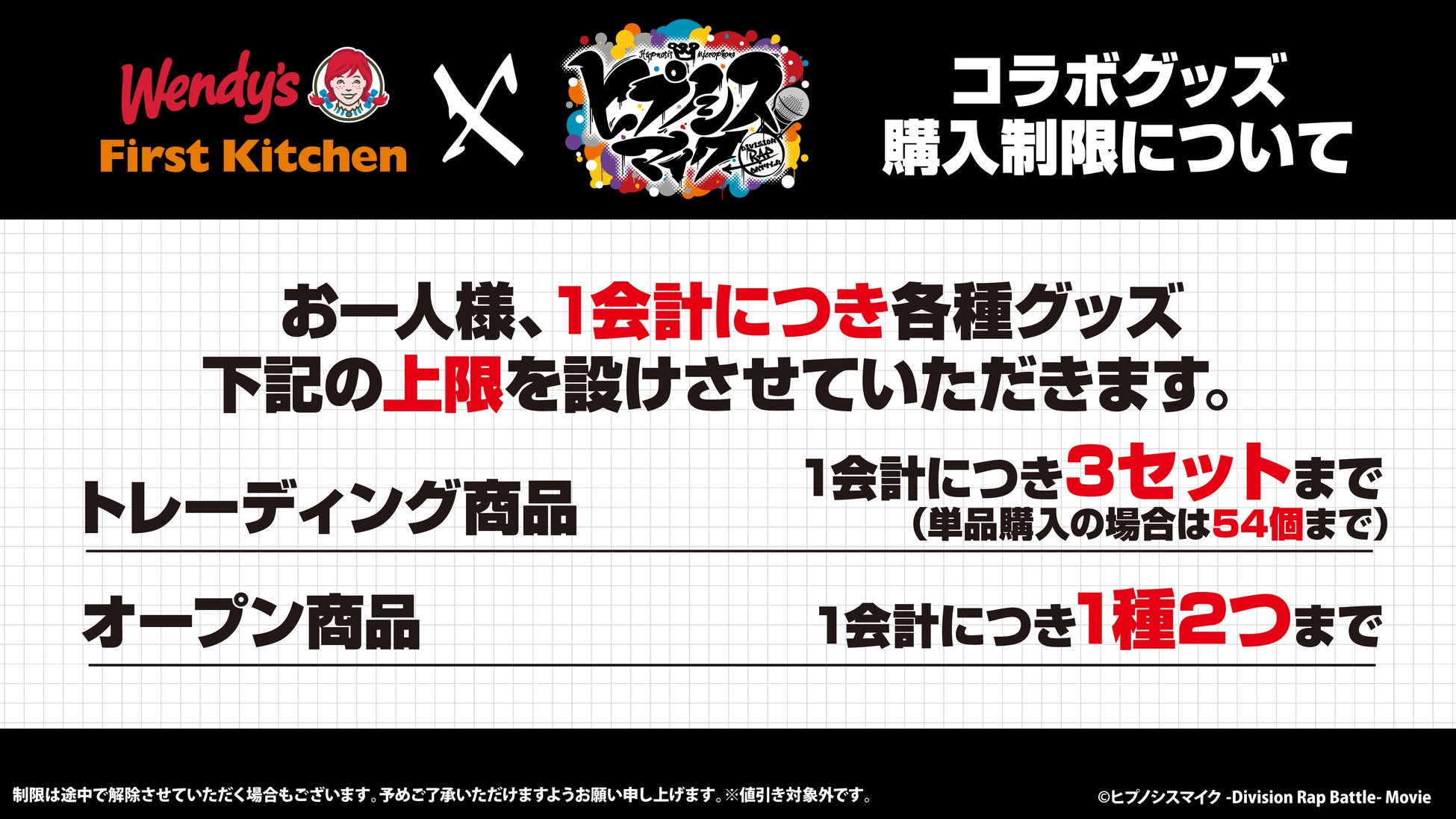 合同会社DMM.com(本社:東京都港区、会長 兼 CEO亀山敬司、https://dmm-corp.com/ 以下DMM )が展開するグッズメーカーサービス「DMM Factory」は、ウェンディーズ・ジャパン株式会社及びファーストキッチン株式会社(所在地:東京都新宿区、代表取締役社長:紫関修)が運営する、「ウェンディーズ・ ファーストキッチン」及び「ファーストキッチン」にて、映画『ヒプノシスマイク -Division Rap Battle-』とのコラボイベントを期間限定で開催いたします。