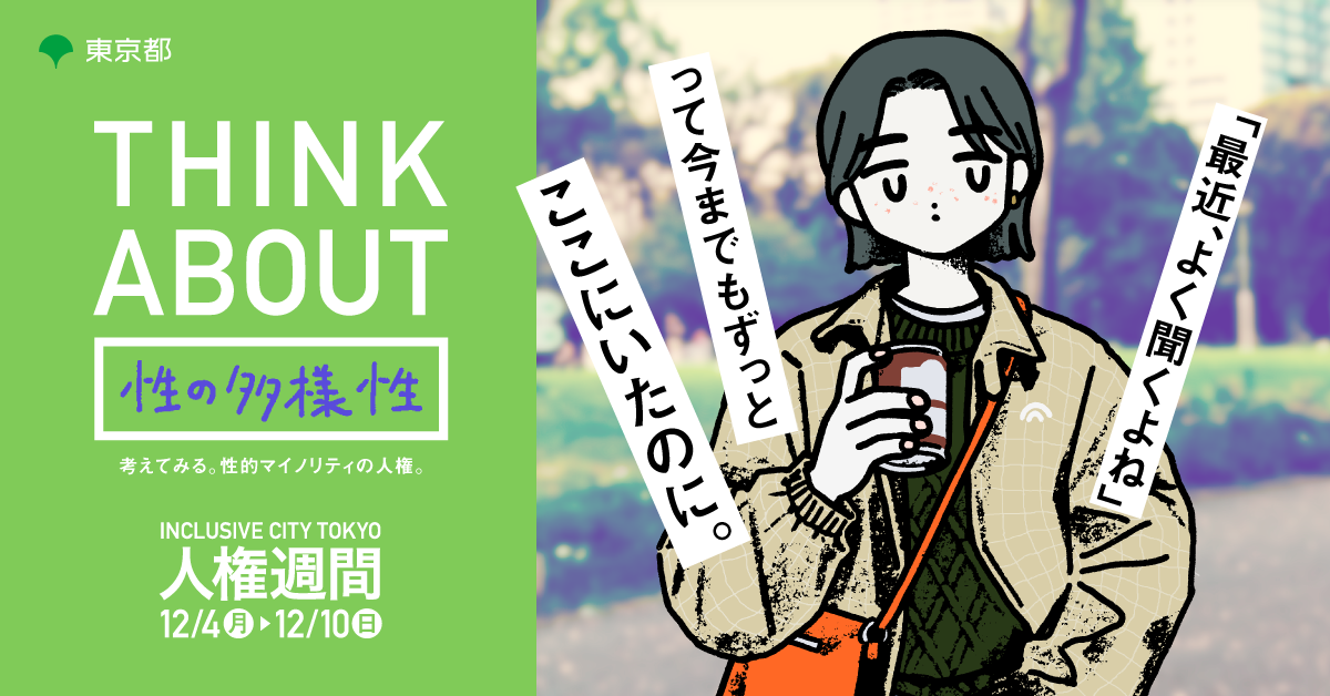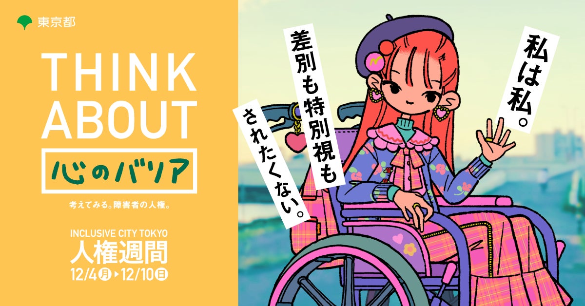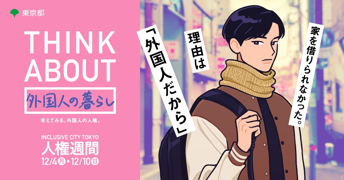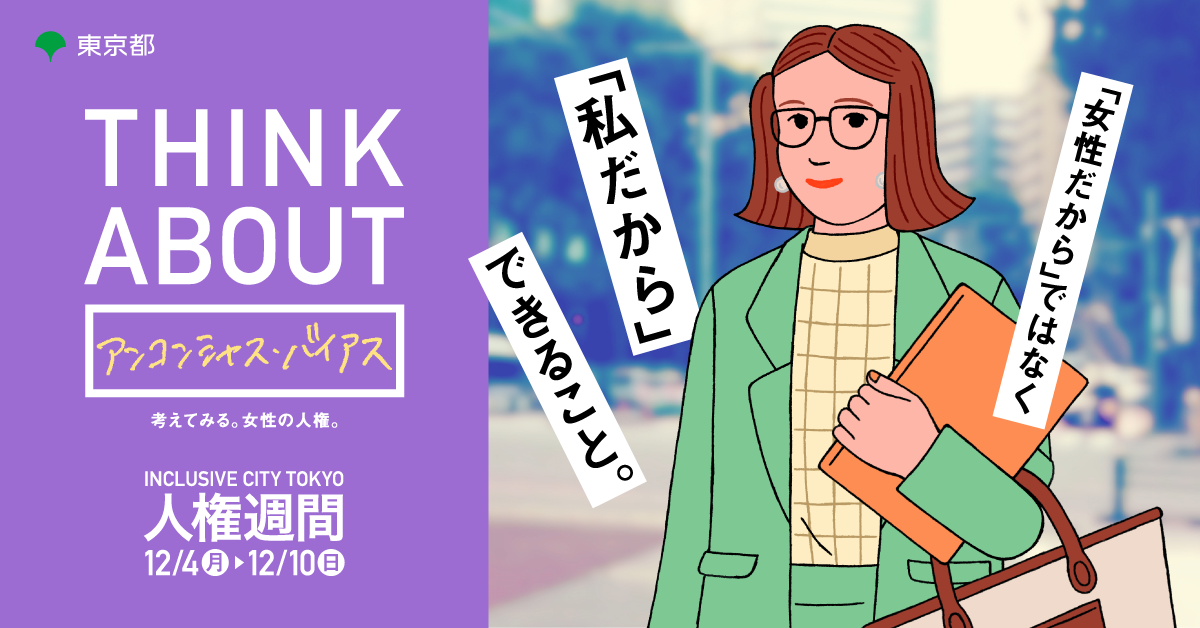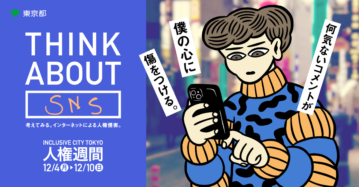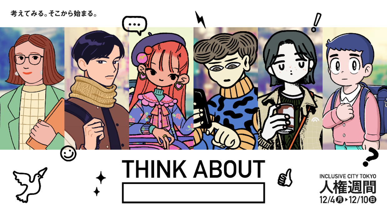 今年度のテーマを「インクルーシブシティ東京」に設定。身近にある人権について考えるきっかけとなるよう、キャッチフレーズに「THINK ABOUT 考えてみる。そこから始まる。」を採用し、当事者の思いが伝わるメッセージで構成。また、6名の異なる画風のイラストレーターを起用し多様性を伝えました。広告は6秒動画を6種と15秒動画を1種制作し、15秒動画では、アニメの声優などで活躍中の石川由依さんにナレーションを務めていただきました。これらの動画はテレビCM、ウェブ広告等で展開予定です。