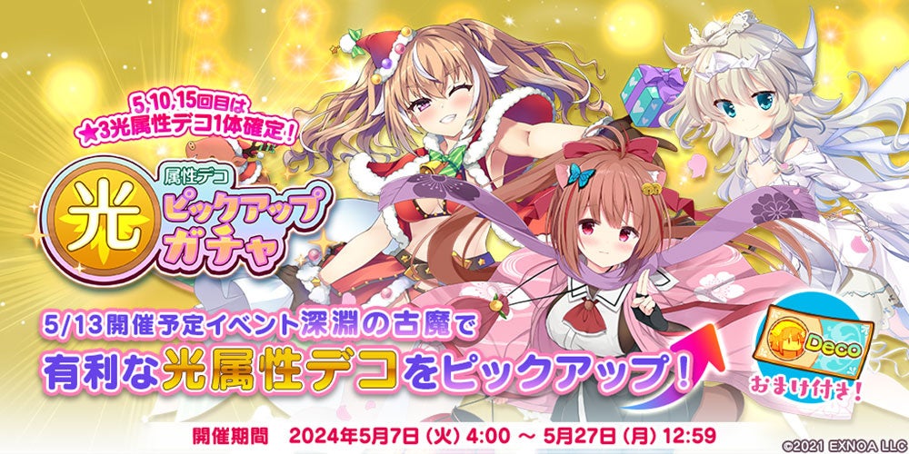 ボスに有利な属性となる「光属性」の限定デコを含む★3デコをピックアップした「光属性デコピックアップガチャ」を実施します。
