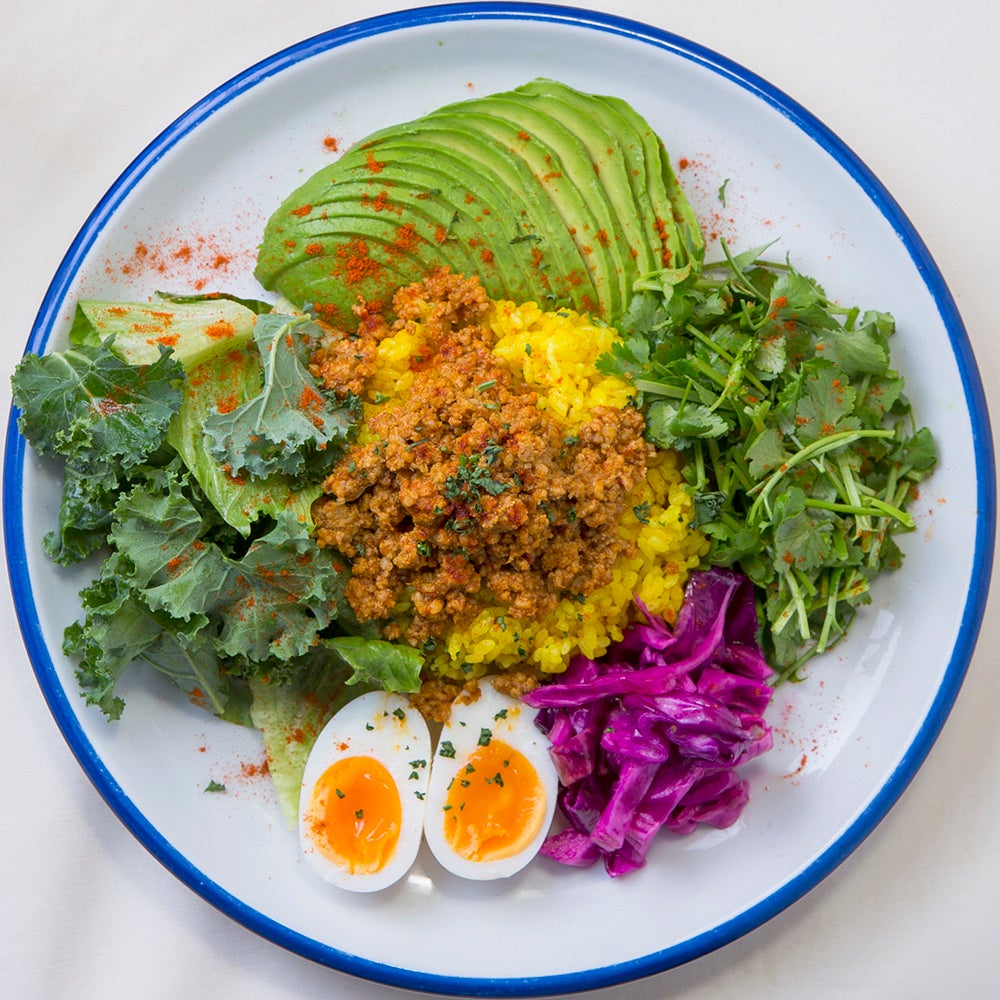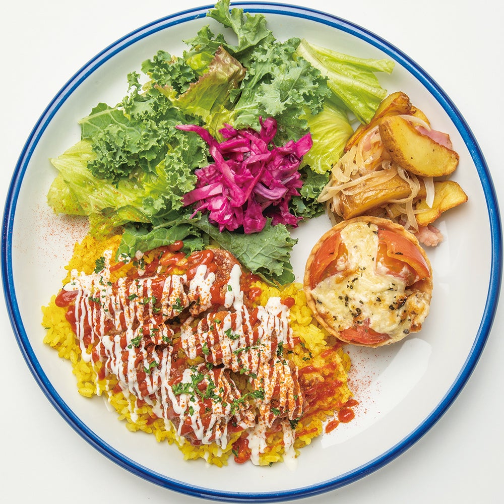 大豆ミートで作ったキーマカレーに、4種の豆とキヌアナッツのマリネや赤キャベツとクミンのマリネも加わった野菜たっぷりメニューです。