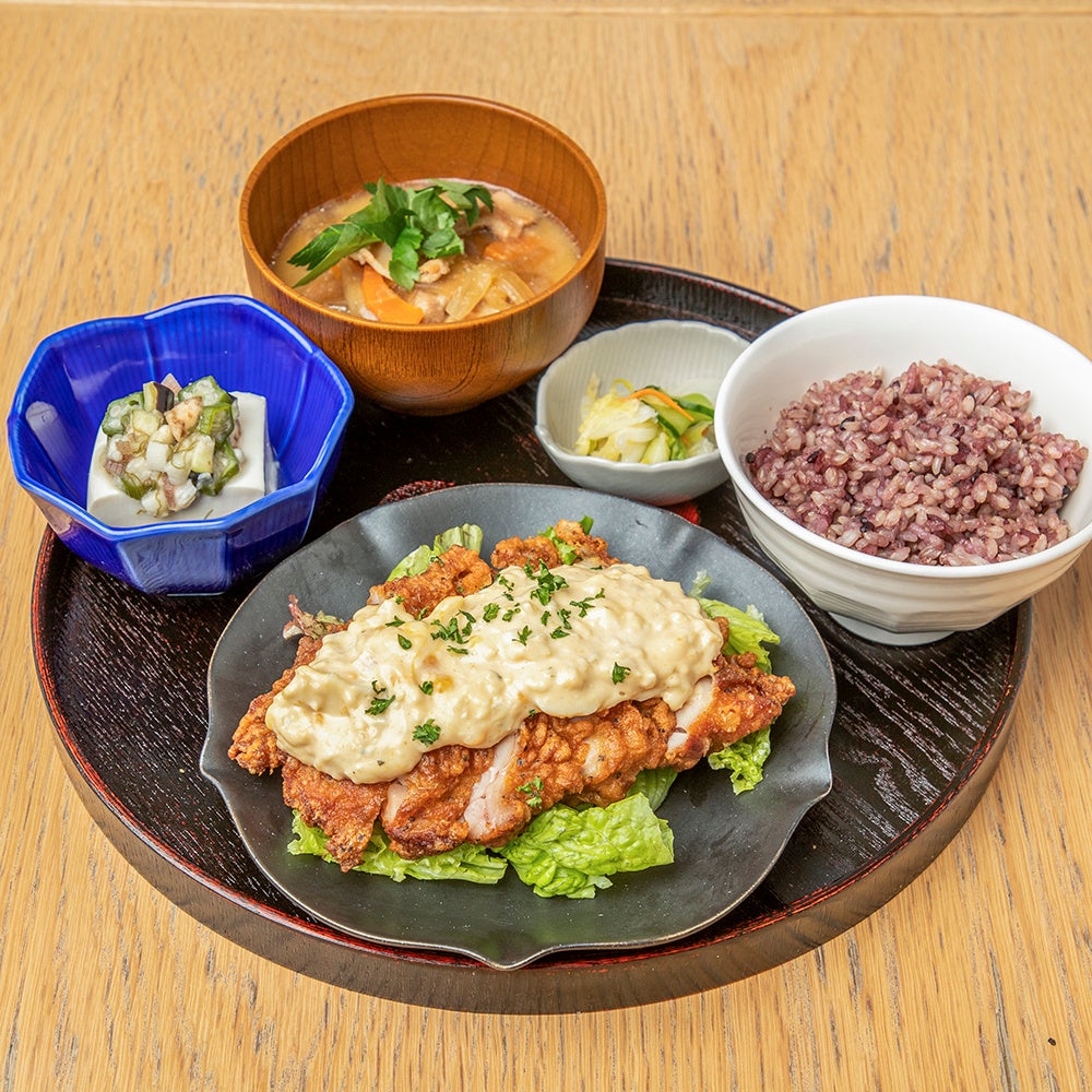 ざっくりつぶした半熟玉子を混ぜ込んだタルタルソースと甘酢の風味が効いたチキン南蛮の相性は抜群。人気No.1 or No.2を争うランチ定食です。