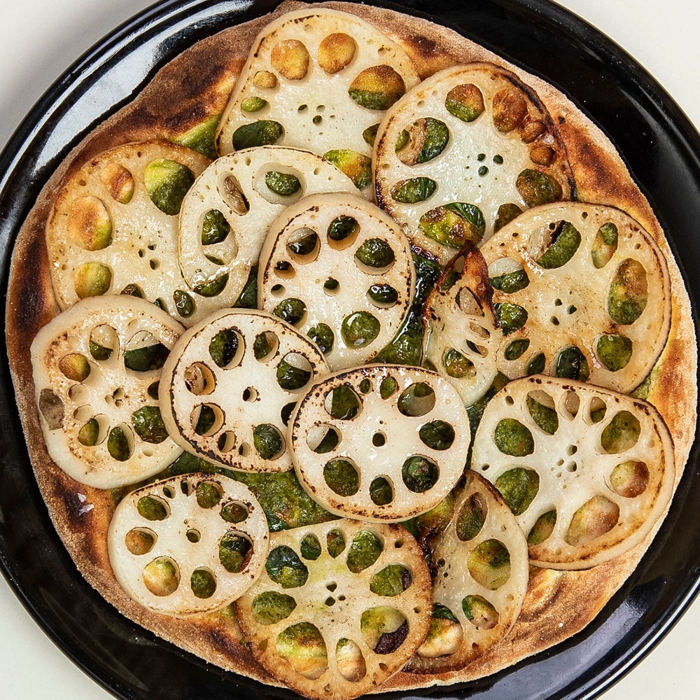 瑞々しい新レンコンの食感が心地よいオリジナルピザ。爽やかな大葉のジェノベーゼソースが、レンコンの持ち味をより引き出しています。