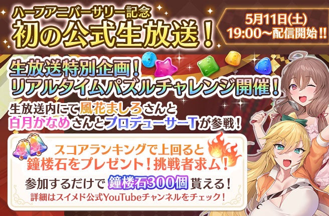 ハーフアニバーサリーを記念した生放送を配信予定。