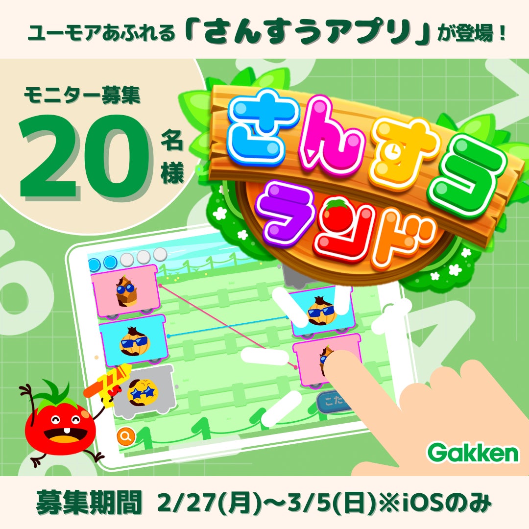 株式会社 学研ホールディングス(東京・品川/代表取締役社長:宮原博昭)のグループ会社、株式会社 Gakken(東京・品川/代表取締役社長:五郎丸徹)が運営する、3~5歳向けの「かず」と「さんすう」が学べる知育アプリ『さんすうランド 20までのかず・ちえ 学研の知育ゲームアプリ』は、iOSアプリの公開開始にあわせ、2023年2月27日(月)よりモニターを20名募集開始しました。モニターの募集締め切りは3月5日(日)となります。