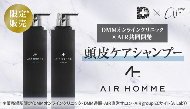 合同会社DMM.com(本社:東京都港区、会長 兼 CEO:亀山敬司、https://dmm-corp.com/ 以下DMM )医療法人社団DMH(理事長:島 佑介)の連携事業であるオンライン診療プラットフォームサービス「DMMオンラインクリニック」(以下「当サービス」)は、ヘアサロンAIRと共同開発したメンズ向けAGAヘアケア商品「AIR HOMME シャンプー&トリートメント」を本日より販売開始することをお知らせいたします。