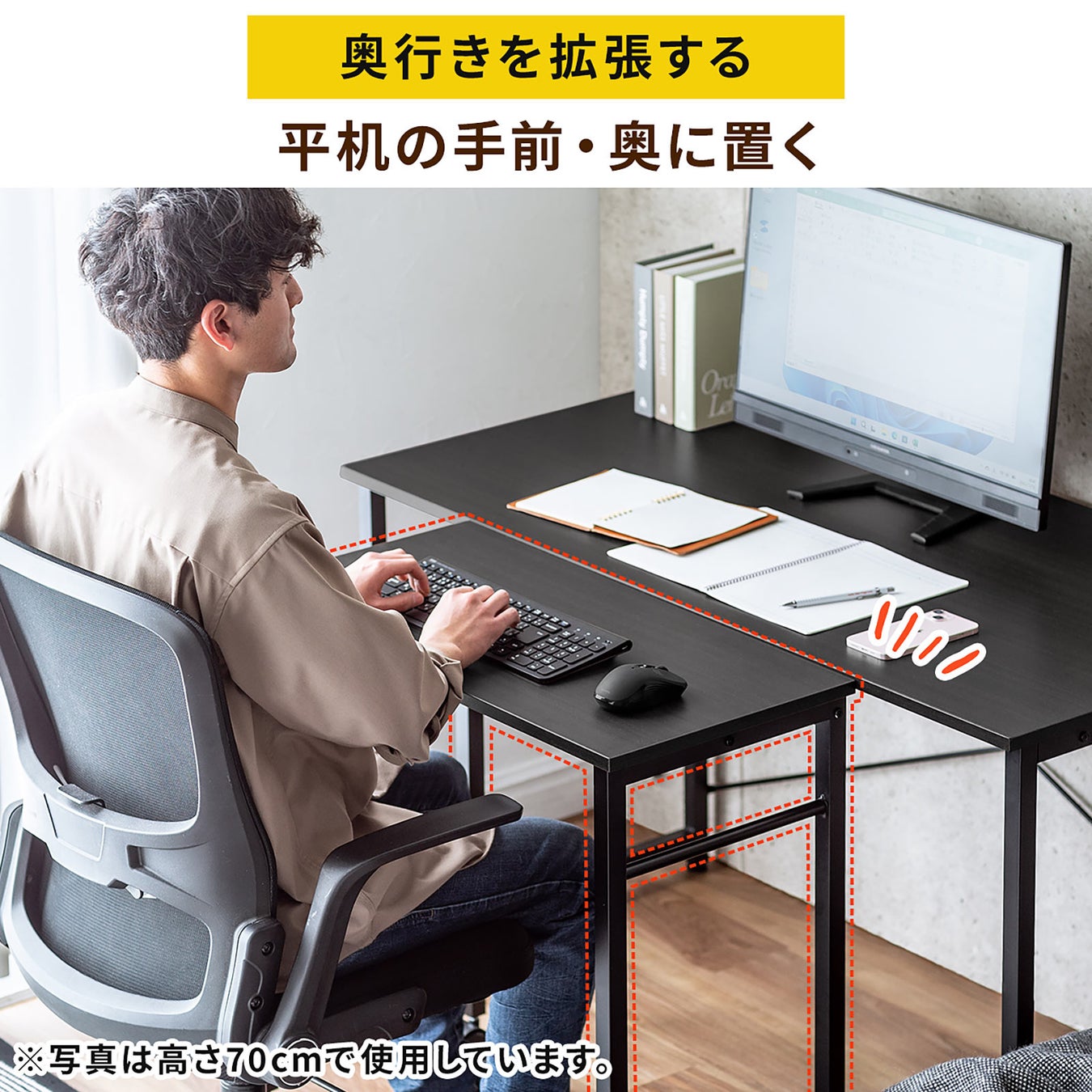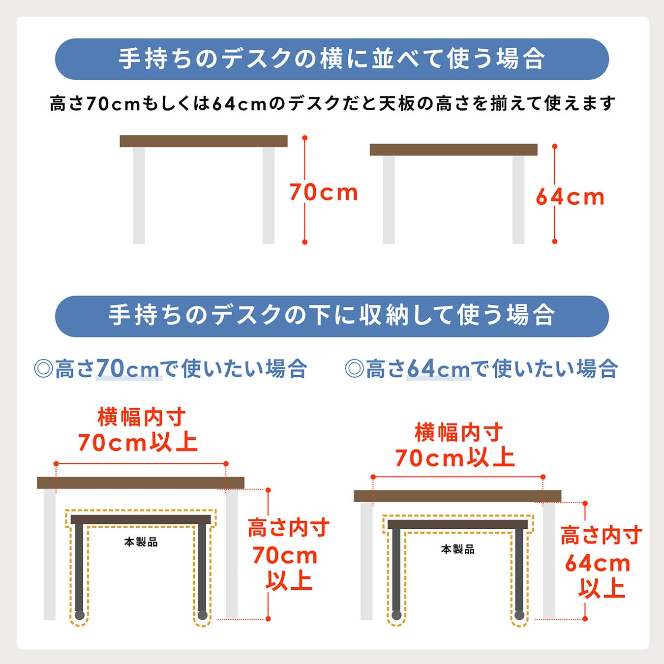 天板の高さを64cmにすれば、収納やキーボード台としても使用可能。コンパクトなサイズなので、ちょっとした作業台としても活躍します。複数台並べて使うことも可能で、使用シーンに合わせて複数台並べての使用も可能です。