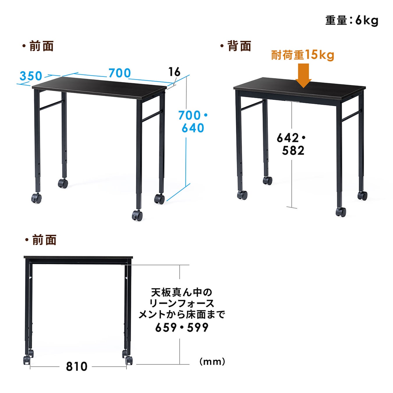 横幅70cm、奥行35cm、高さ70cmのキャスター付きデスクは、高さを選んで組み立てることができ、総耐荷重は15kg。これにより、作業スペースを自在に拡大できます。また、配置の仕方によっては、既存のデスクを拡張するサブデスクとしても利用可能です。