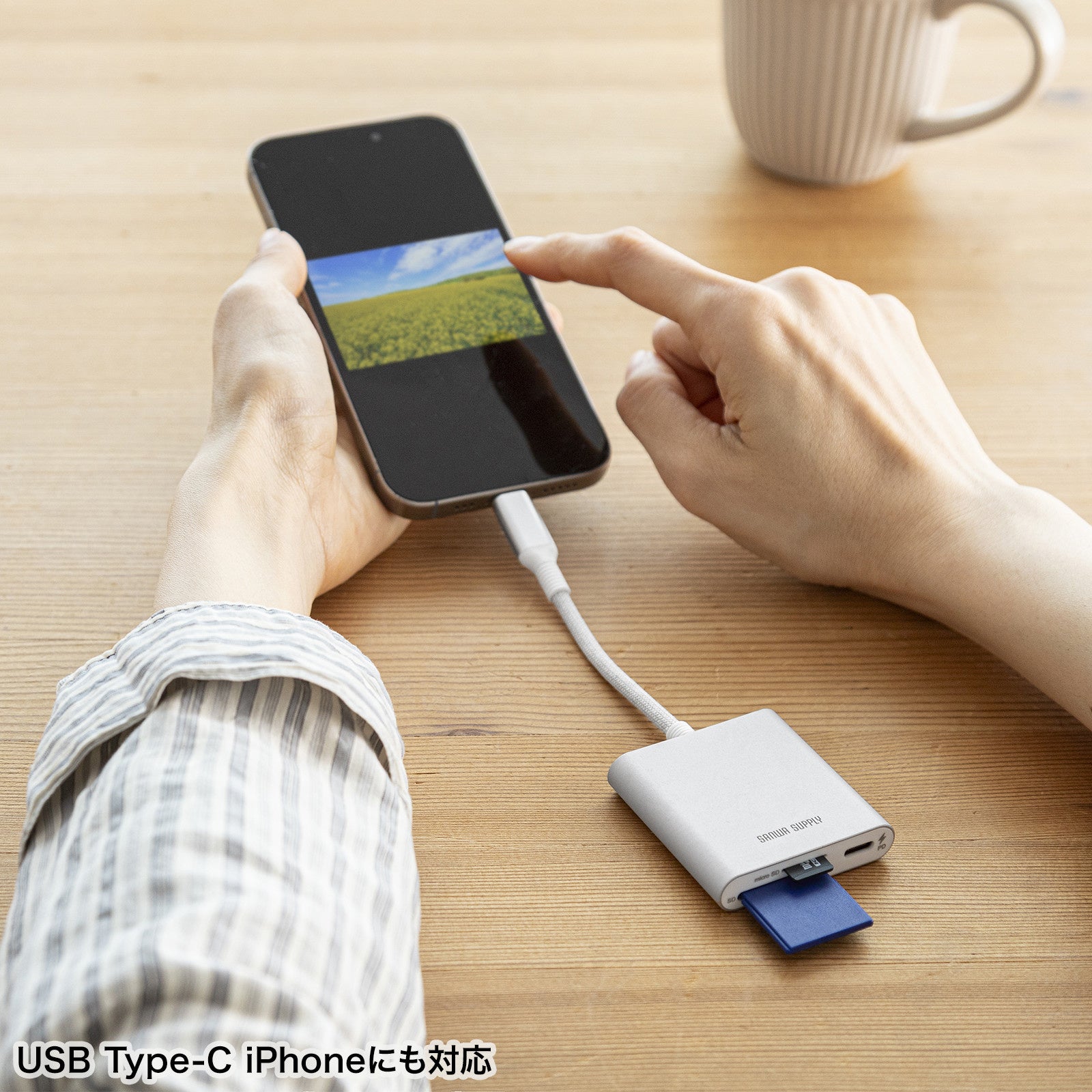 Type-C搭載のスマートフォン、タブレット、パソコンで使用できるカードリーダーです。