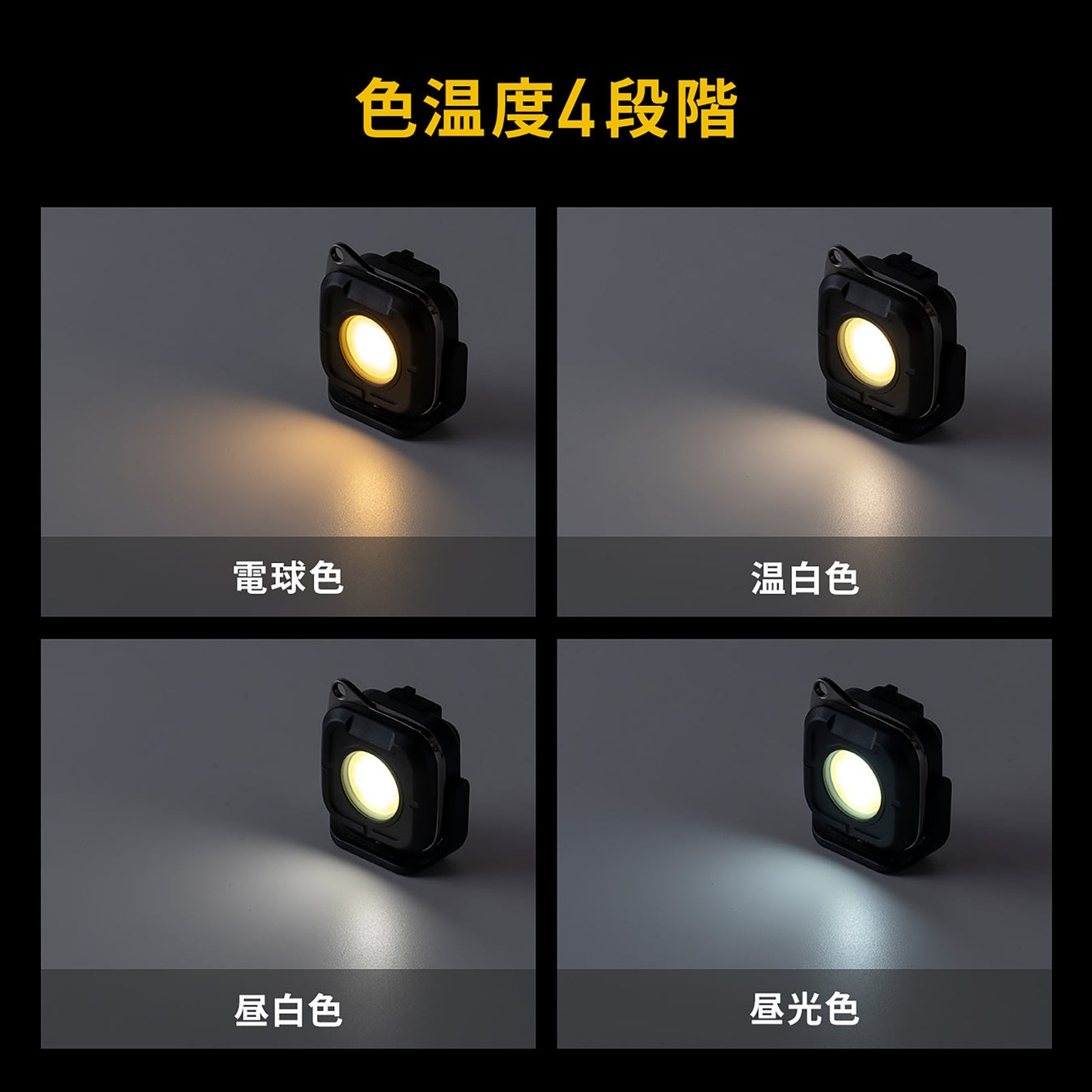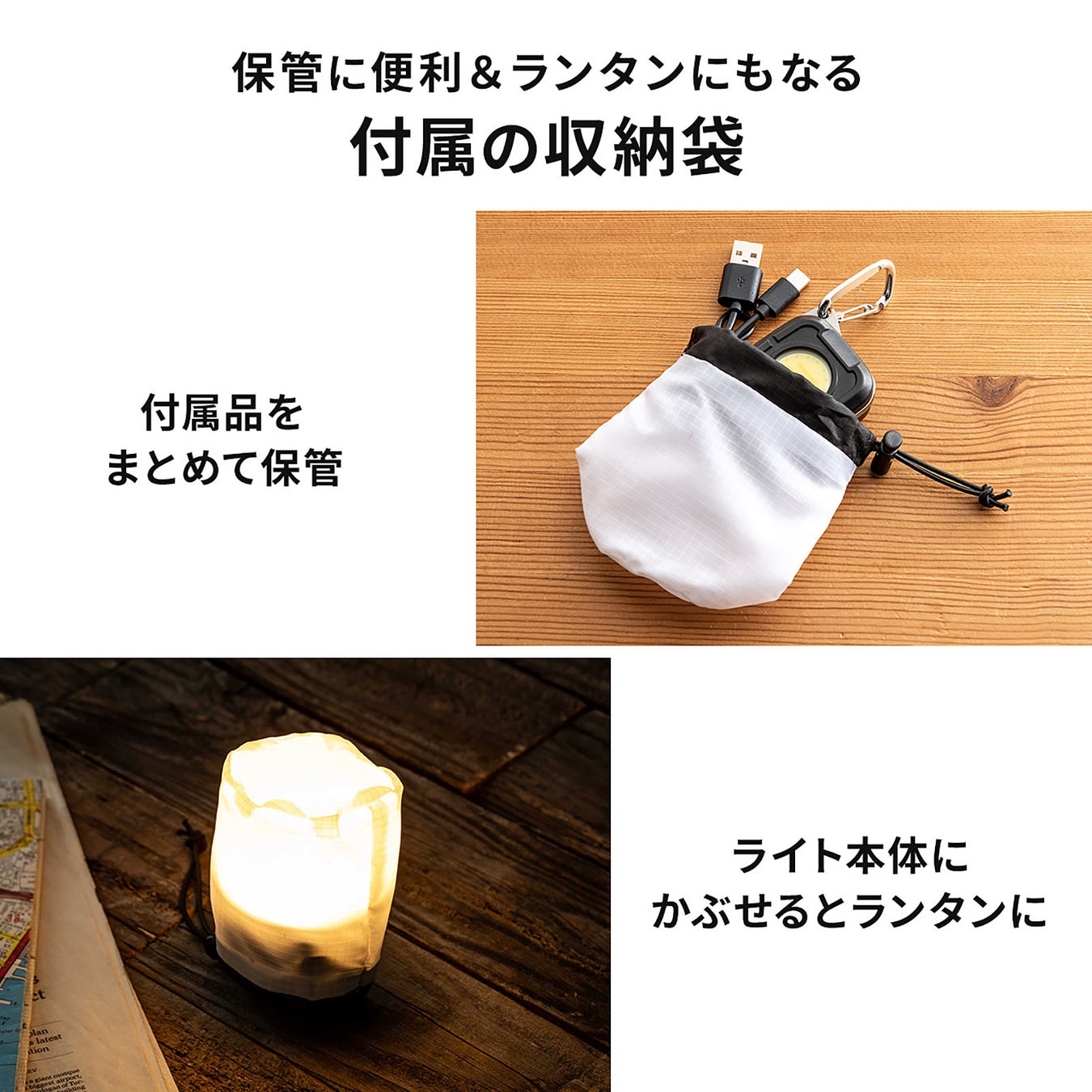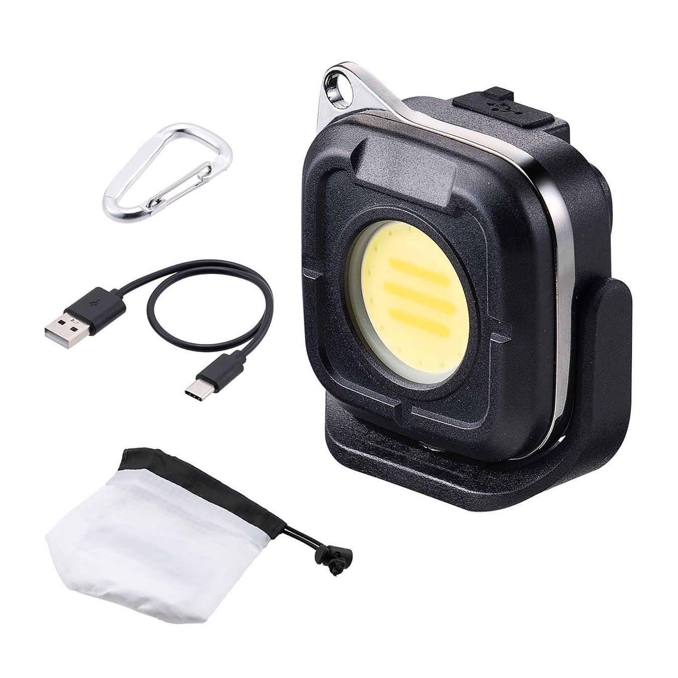 ON/OFFスイッチで4段階の明るさ調整が可能で、赤色点灯/点滅モードも搭載。吊り下げ用カラビナフックやマグネット、バッテリーインジケータ、収納袋も付属しており、様々なシーンで使い勝手抜群です。