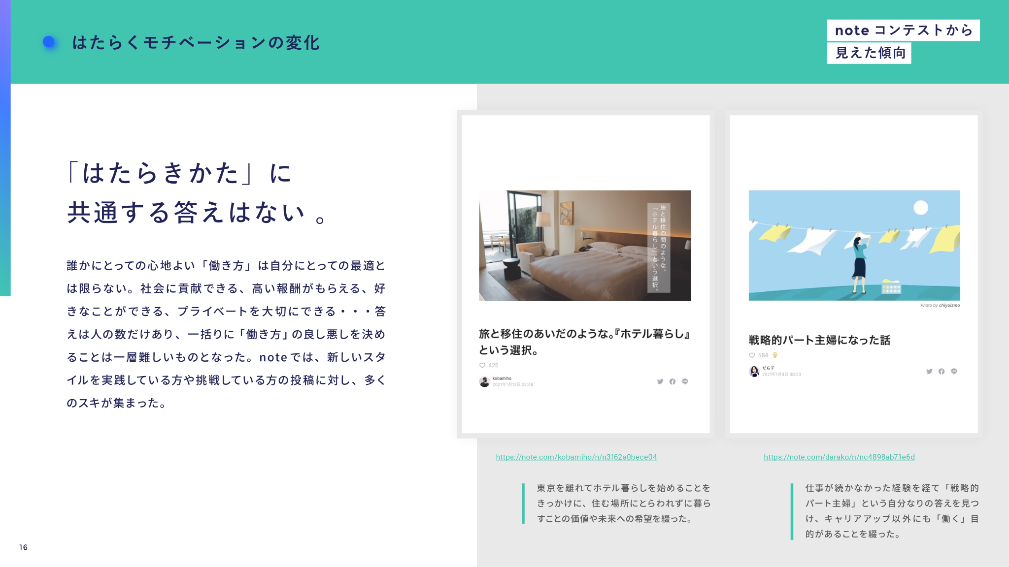 生活のため、好きなことのため、身近な人のため、あるいは社会のために。noteではこれまで「働く」にまつわるさまざまなエピソードが投稿されてきました。今回、そうした多くの生の声を参考にし、大量のデータに基づく調査とも違う、「想いを感じるレポート」へと仕上げることができました。このレポートが、読んだ人にとって自分なりのはたらき方・やりたいことを見つめ直す機会になれたら幸いです。さまざまな投稿をくださったnoteクリエイターのみなさん、本当にありがとうございました。
