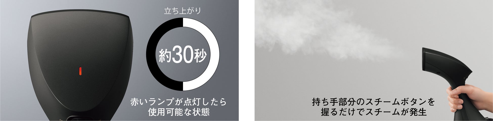 3. 約30秒のすばやい立ち上がり。グリップを握るだけで噴射できるスチームボタン