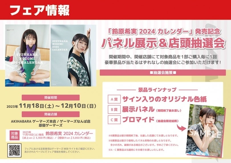 株式会社カードラボ ゲーマーズ(本社:東京都豊島区、https://www.gamers.co.jp/以下ゲーマーズ )は、2023年11⽉18⽇(土)より 「鈴原希実カレンダー」発売記念パネル展示&店頭抽選会 を開催することをお知らせいたします。