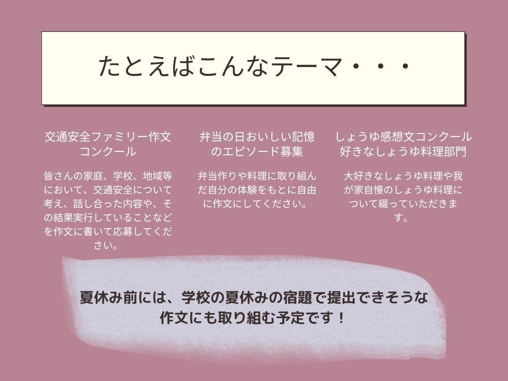 子どもたちが普段書くような「身近な生活文」「行事の感想文」ではなく、毎回、少し変わったテーマや日常を異なる角度からとらえられるテーマを用意しています。