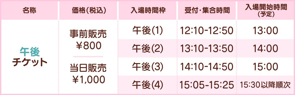 ●事前販売:「午後(1)~(3)」の入場枠のみ、先着順にて事前販売受付中。