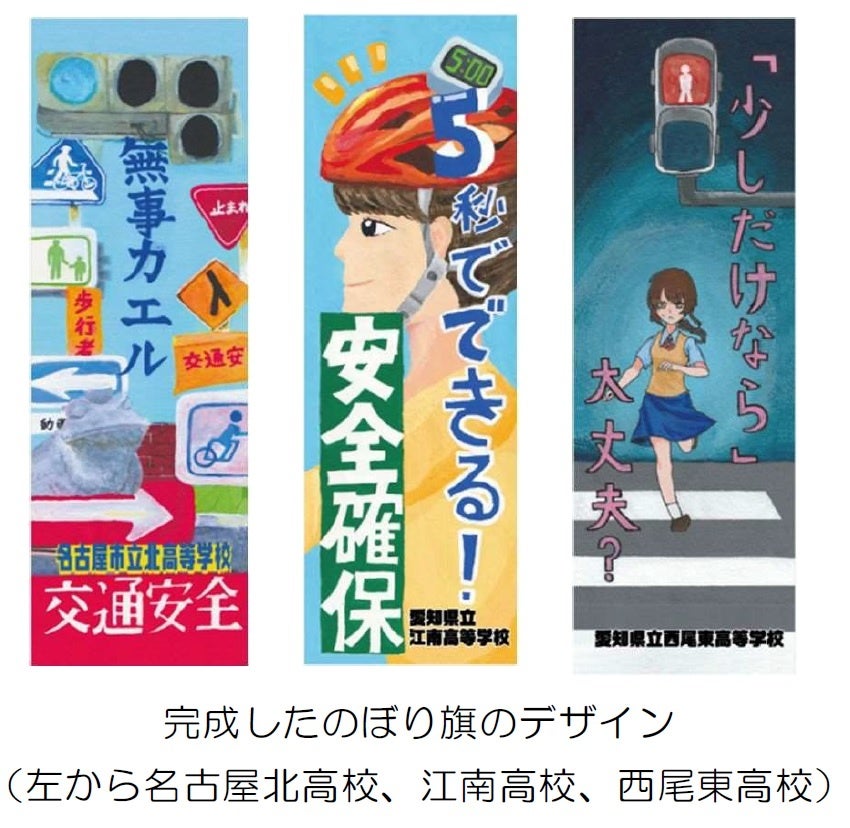 愛知県内の高等学校と一般財団法人愛知県交通安全協会との産学連携活動として、これからの交通社会を担う若い世代の視点から見た交通安全啓発を目的とし、今年度は「名古屋市立北高等学校」「愛知県立江南高等学校」「愛知県立西尾東高等学校」の美術部員によりデザインされたのぼり旗を制作しました。