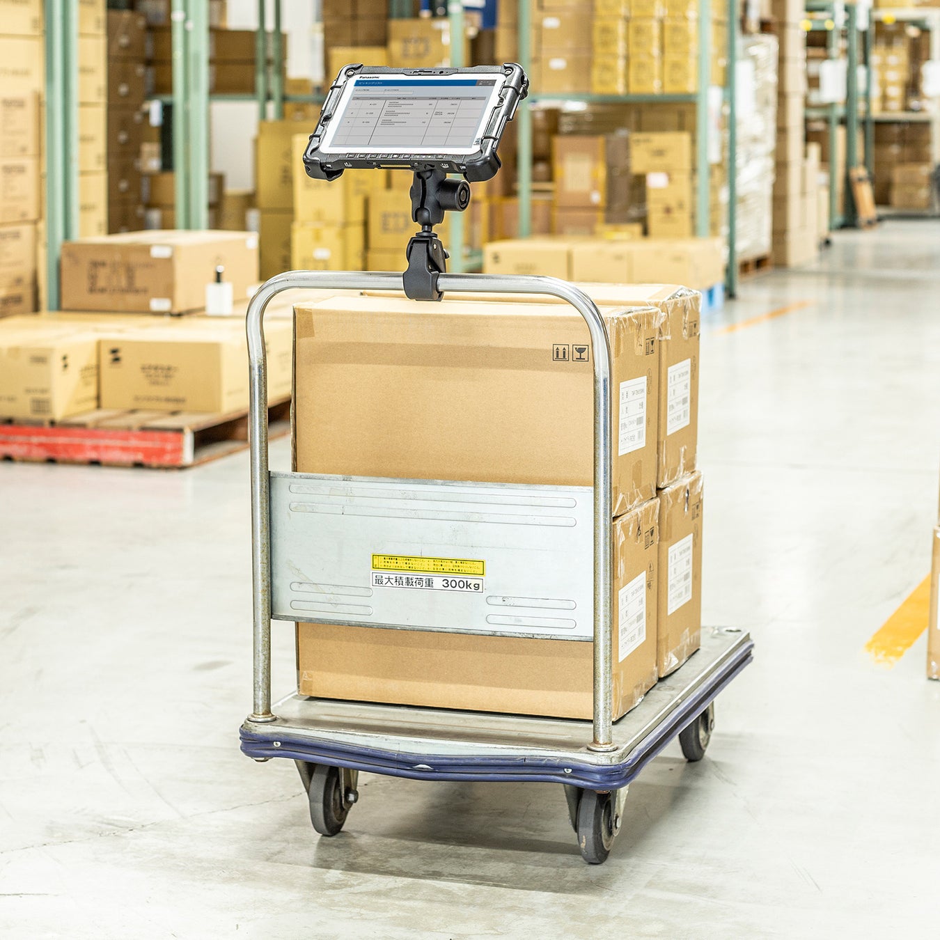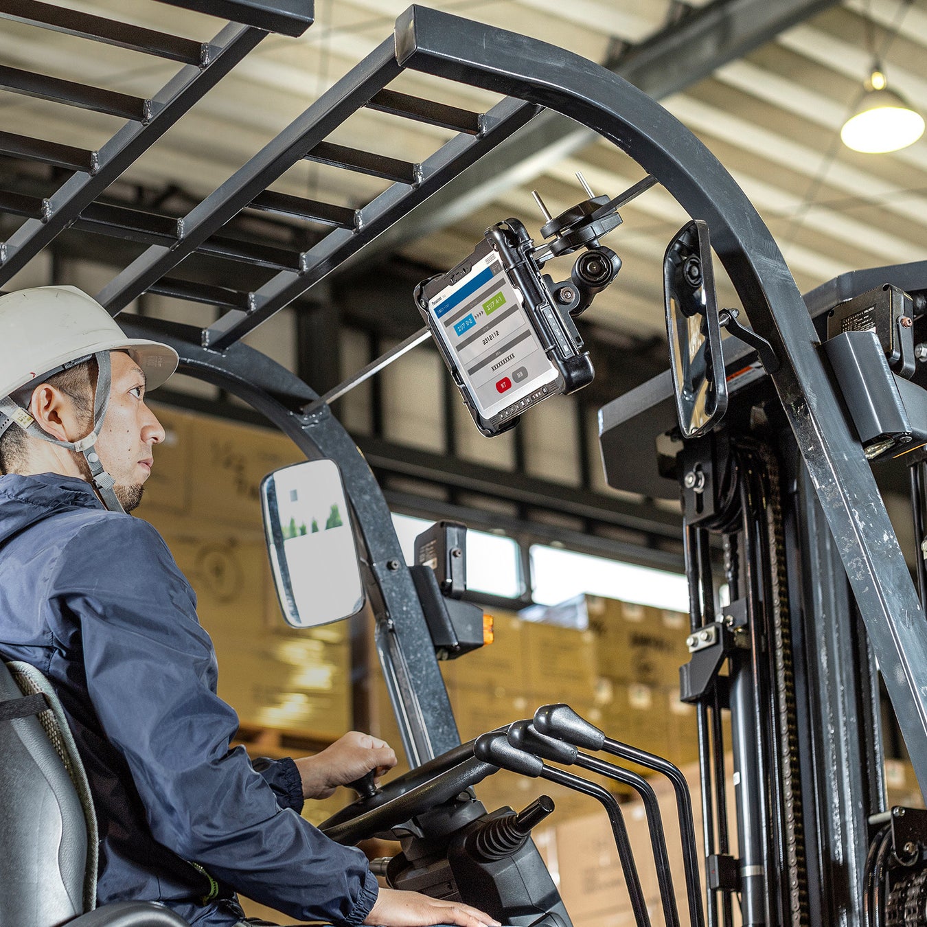 フォークリフトや台車などに産業用タブレットを固定できるホルダーです。タブレットを使用する生産管理・現場業務をスムーズに進められます。
