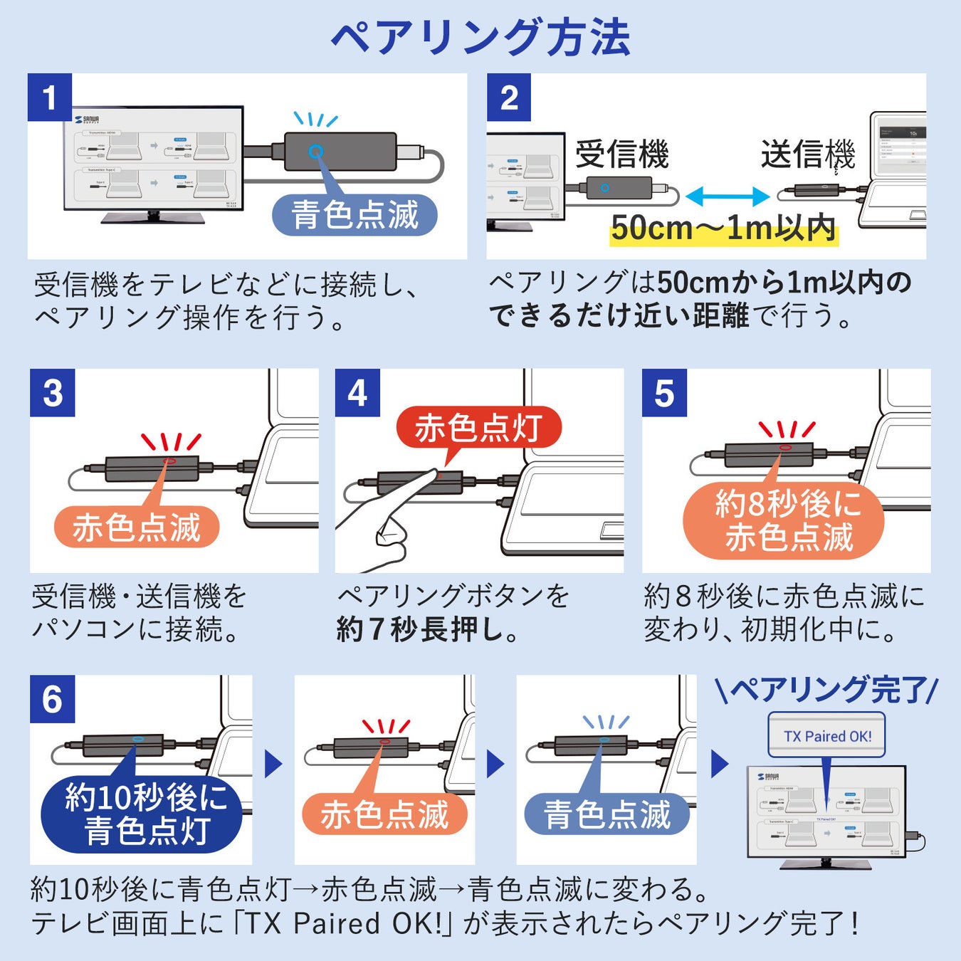 増設用の送信機は、ボタンを約7秒間長押しするだけで簡単にペアリングができます。長押しした後、LEDが青色点滅に変わったらペアリング完了です。