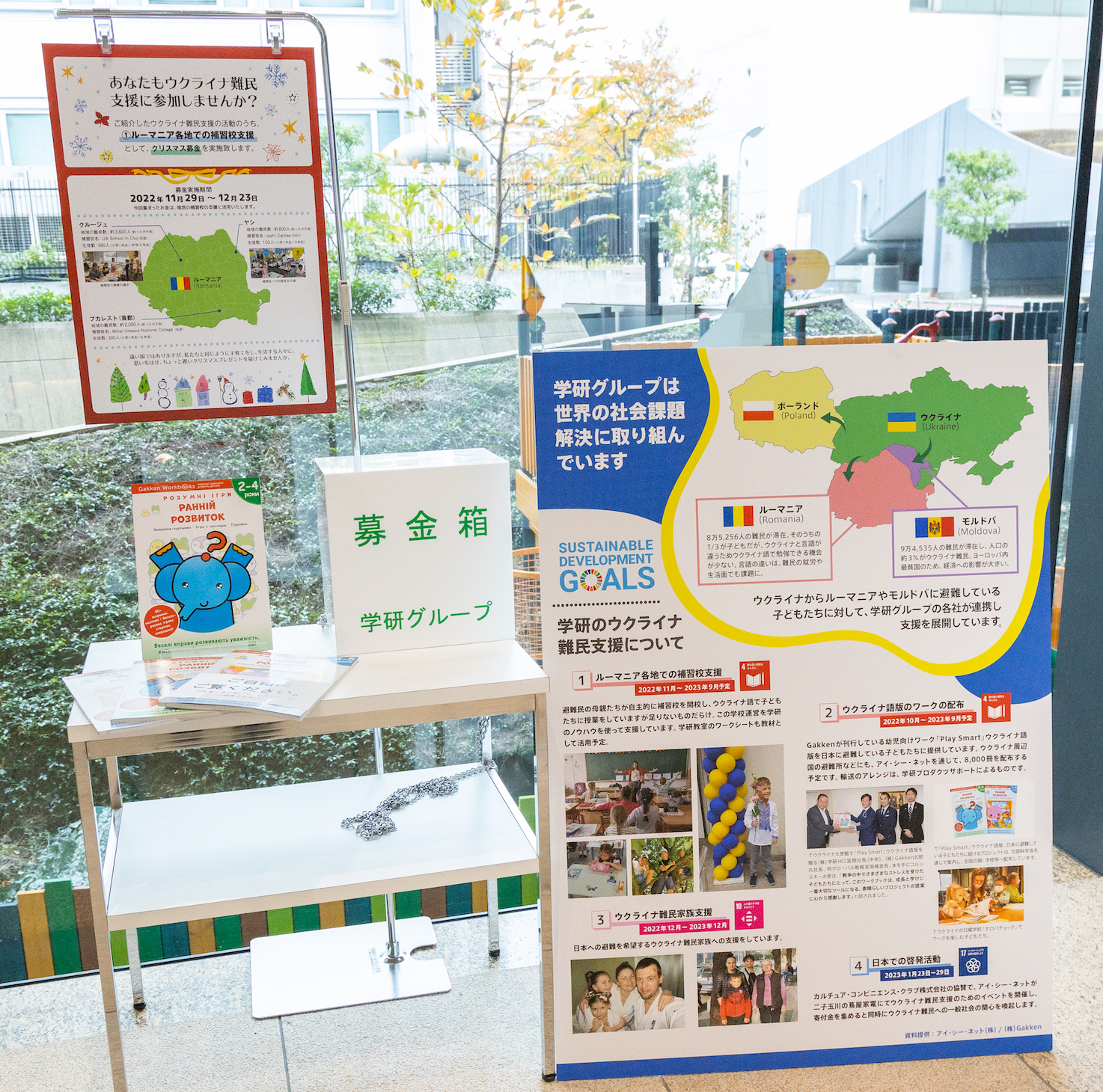 2022年11~12月に学研東京本社ビル1階エントランスに募金箱を設置し、弊社グループ社員はもちろん、来館いただいたお客様、Gakkenこどもえんに通っていらっしゃる園児の保護者の方々、弊社OB団体など、多くの方々にご参加いただき、ウクライナ支援募金を実施しました。期間中、合計52万3,362円が集まり、ルーマニアに避難しているウクライナの子どもたちのための補習校の先生方の給与として寄付いたしました。