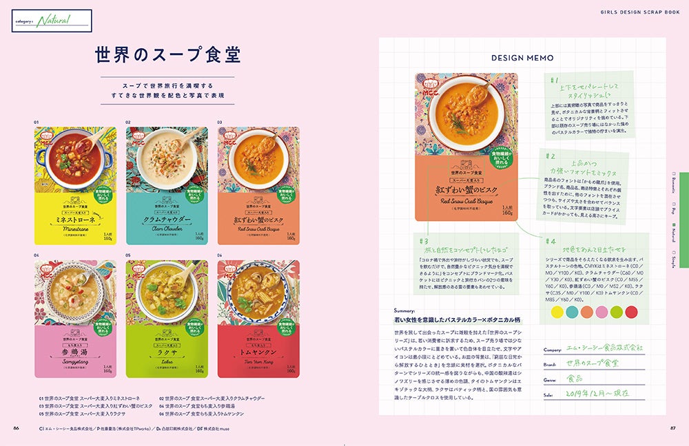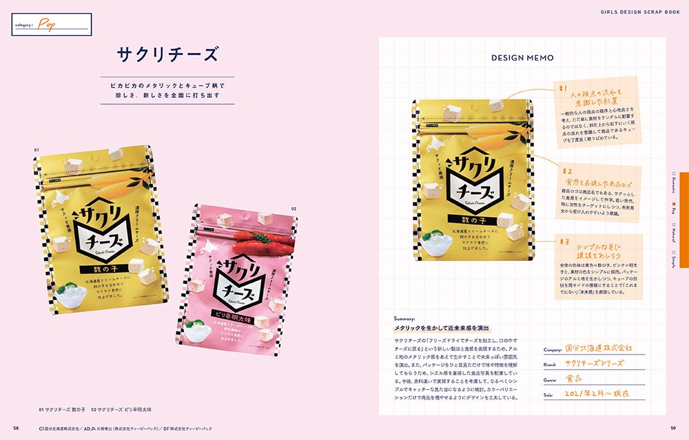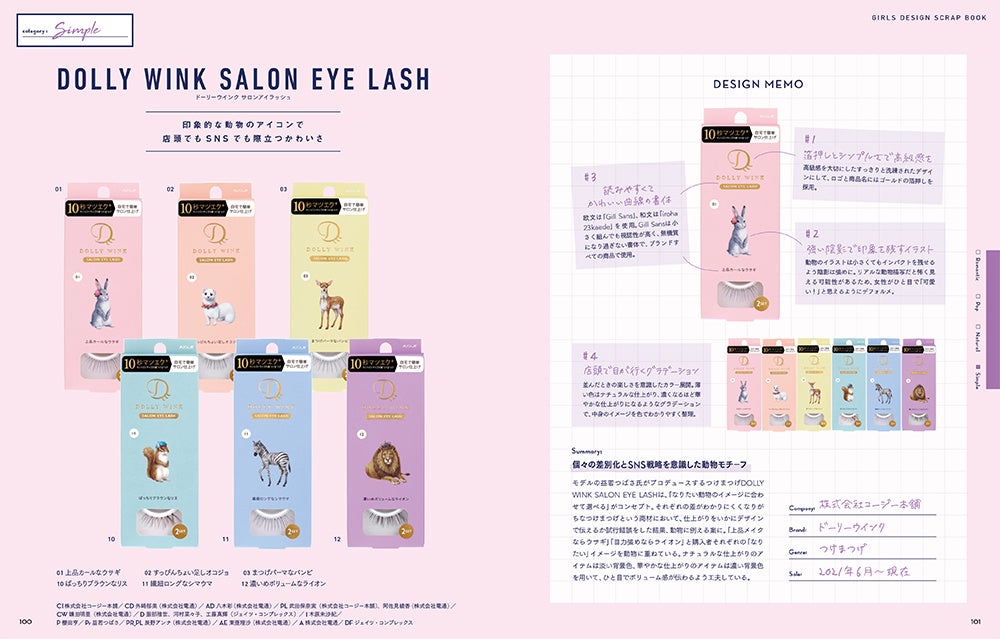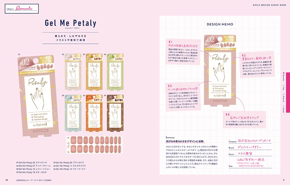 本書は素敵なデザイン実例をまとめた見本&アイディア帳です。掲載アイテムは、コスメ、食品、飲料などから全部で60点。店頭、雑誌、ネット、SNSと商品を目にする場所が変化するなかで、商品の魅力をアピールするのはもちろん、ターゲットである女の子に訴求するために工夫された実例デザインを集めました。デザインを実現するためのアイディア・ポイントを、デザイナーや広報担当者など、実際に制作に携わった方々に伺った内容をもとにまとめています。