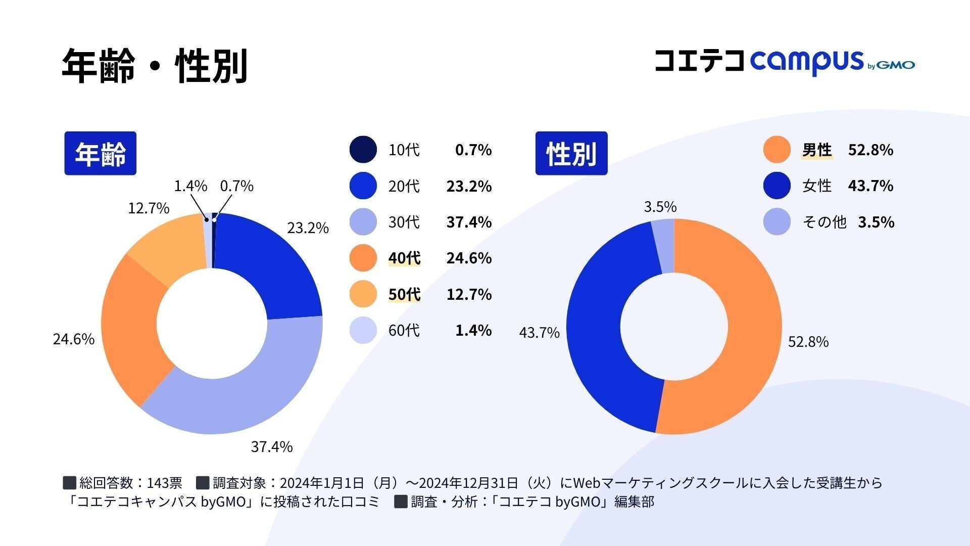 調査結果によると、Webマーケティングスクールの受講者は30代(37.4%)が最も多く、次いで40代(24.6%)、20代(23.2%)、50代(12.7%)と続いています。
