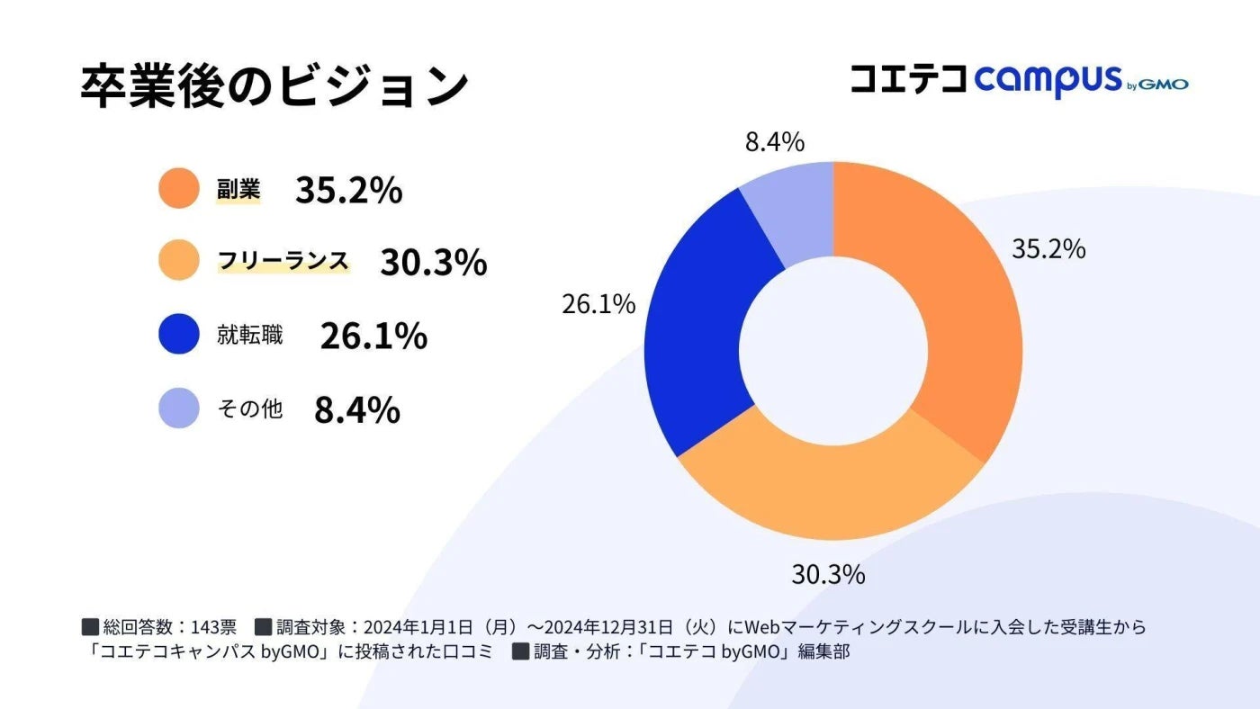 卒業後のビジョンに関する調査では、「副業」を選ぶ割合が35.2%と最も高く、入会理由として「Webマーケティングを副業にしたかった」と回答した1.4%から、33.8ポイントも上昇しました。多くの受講者が、スクールでの学びによってキャリア観に大きな影響を受けていることがうかがえます。