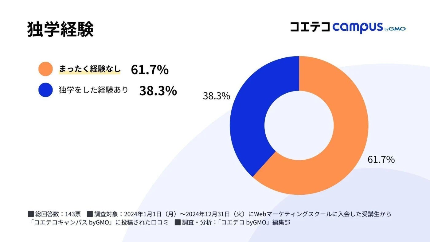 独学の経験については、Webマーケティングでは「まったく経験なし」が61.7%、「独学経験あり」は38.3%となり、プログラミングスクール、Webデザインスクールとの中間的な位置付けとなりました。