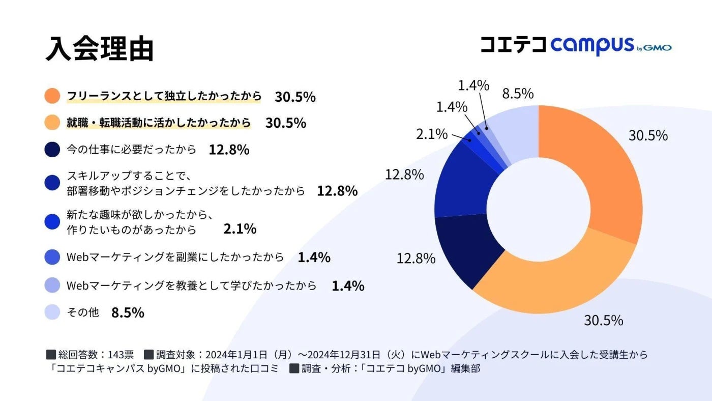 ・スクール入会理由は「フリーランスとして独立したかったから」「就職・転職活動に活かしたかった」が同率1位(30.5%)