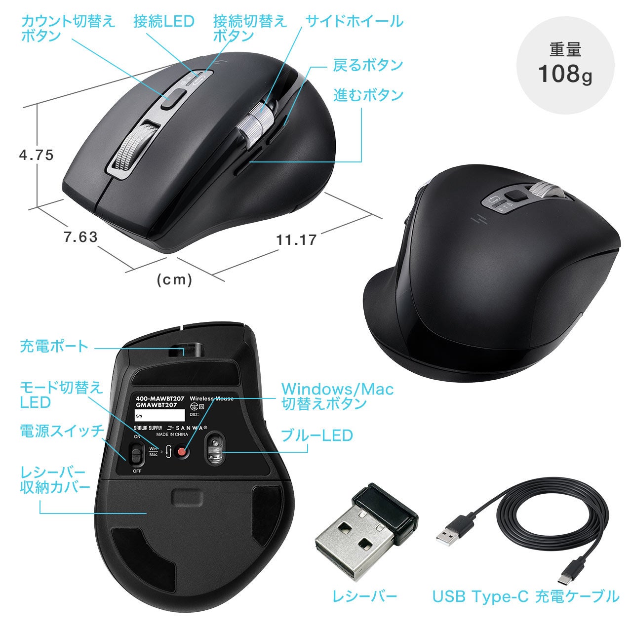Bluetooth接続は最大2台の機器へのマルチペアリングに対応しており、Bluetooth×2台、レシーバー接続1台の3台で切替えて使用できます。サイドに「戻る」「進む」ボタンを搭載で、Webブラウザ等での操作をスピーディーに行えます。