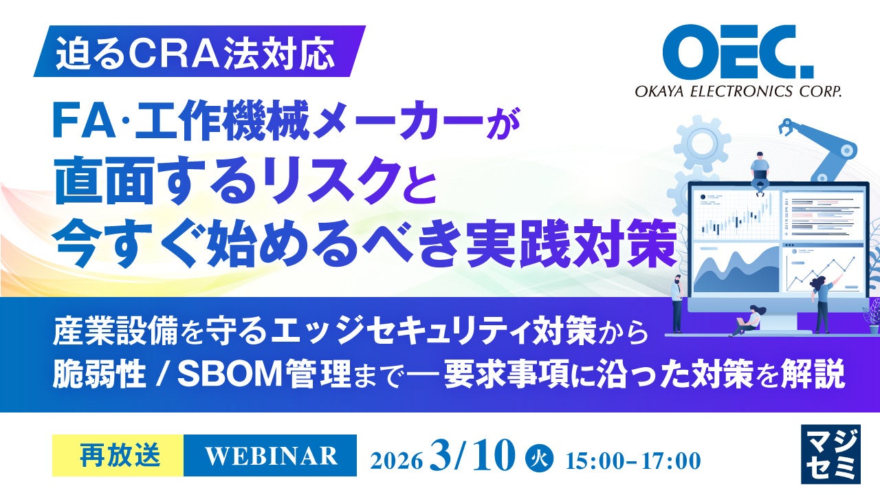 マジセミ株式会社は、大変好評をいただいた「【再放送】【迫るCRA法対応】FA・工作機械メーカーが直面するリスクと、今すぐ始めるべき実践対策」というテーマのウェビナーを再放送します。