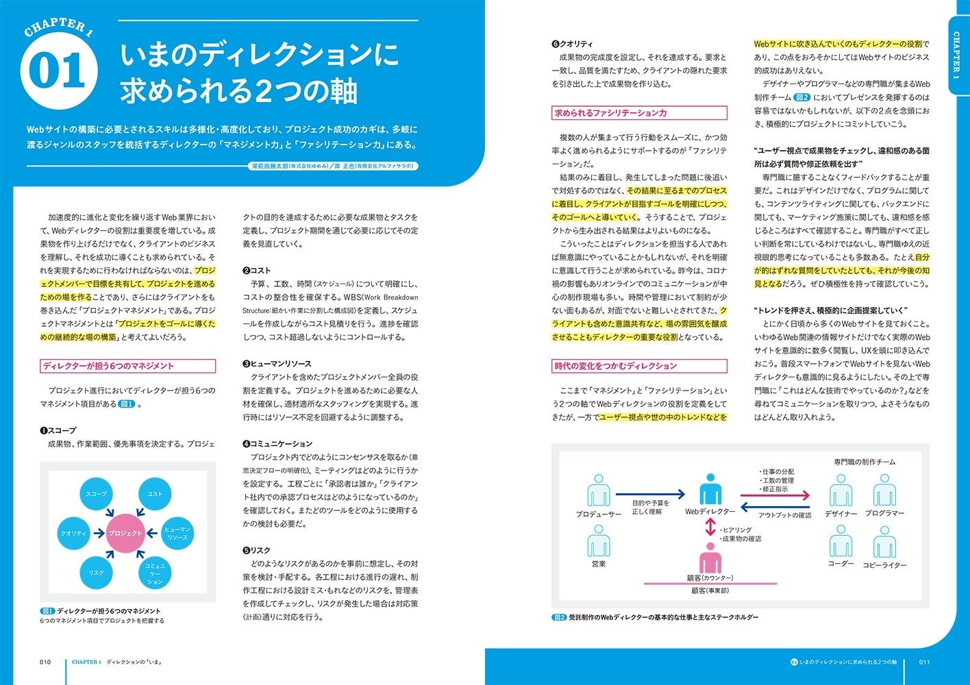 いわゆる制作・進行管理だけをディレクションと捉えず上流工程に重きを置いている点や、必要と感じた知識から効率的に吸収してもらえるよう、トピックス形式で簡潔にまとめている点も、本書の特長です。