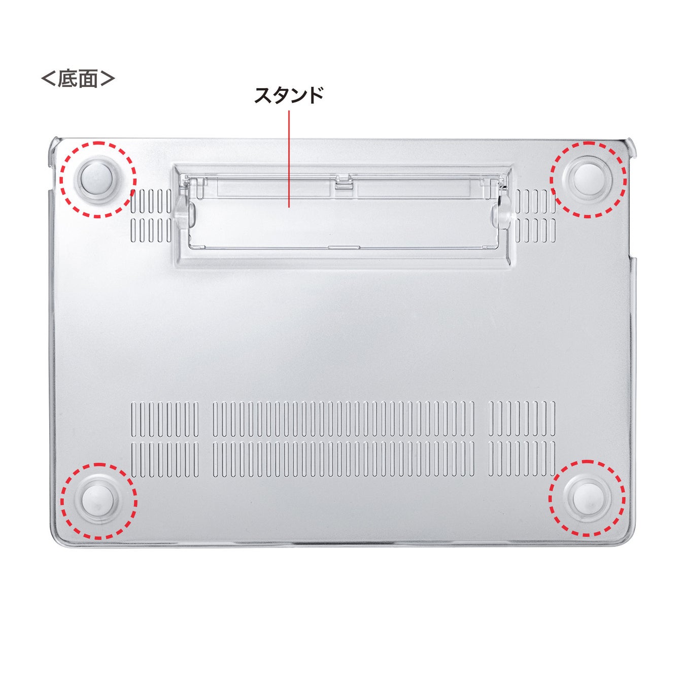 底面カバーには4個の滑り止めパーツが付いているので、キータイピングなどの操作時に本体がずれるのを防ぎます。また、複数の孔が開いており、カバーを使用し続けていても本体に熱が溜まりにくくなっています。