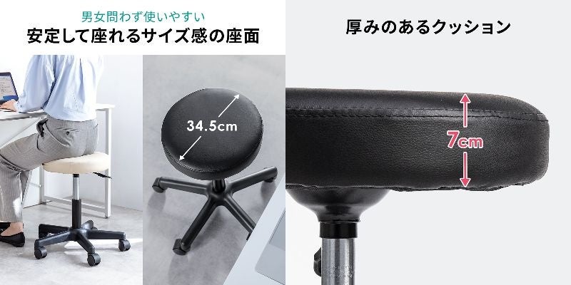 直径5cmのナイロンキャスターが搭載で、座ったまま移動もラクラクすることができます。座り心地と安定感に優れる直径約34.5cm、厚み約7cm座面を装備しています。