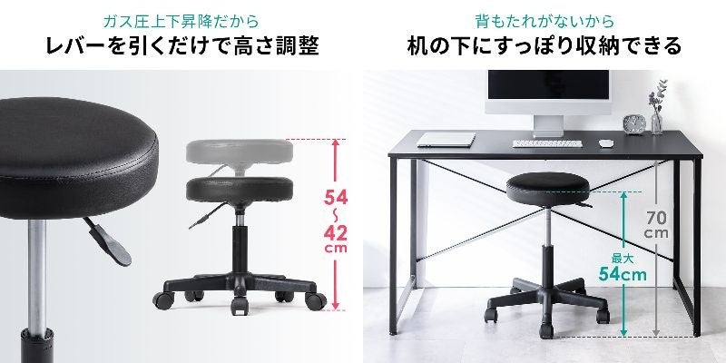 机の下に収納でき、圧迫感もなくいろいろなシーンでご利用いただけます。座面下のレバー操作で座面の高さを調整でき、昇降幅は約12cmです。