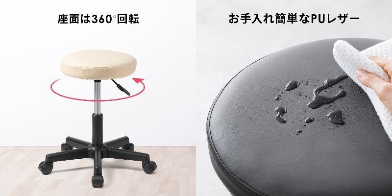 座面が360°回転するので、座ったまま身体の向きを変えられます。お手入れ簡単なPUレザー生地を採用しています。