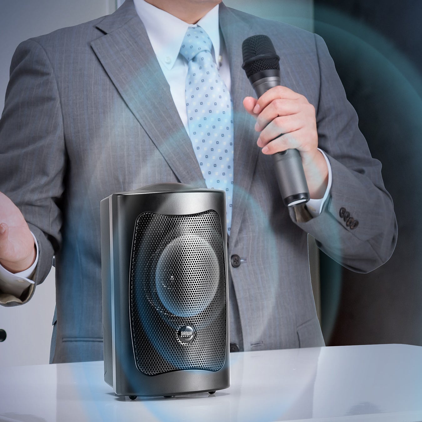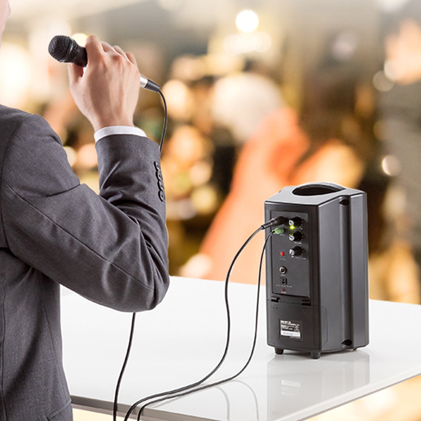 会議やパーティー、イベントなど、様々な場面で手軽に使用できる拡声器スピーカーセット。ワイヤレスマイクと有線マイクがそれぞれ1本ずつ付属し、場面に合わせて使い分けることができます。軽量でコンパクトな設計ながら、最大16Wの高出力を誇り、約100平方メートルの広い空間での使用に最適です。