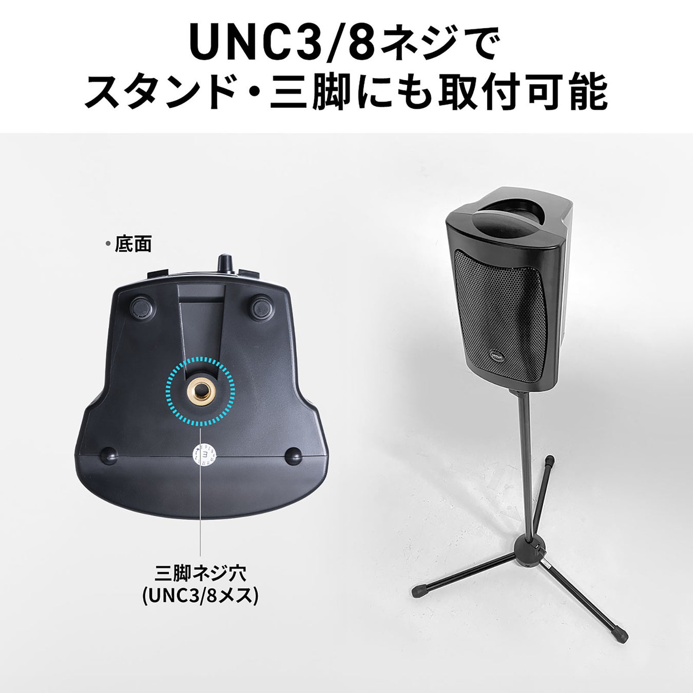 音楽や外部入力からの音声をミキシングして出力できる機能も搭載。更に、三脚ネジ穴を備え、スタンド付スピーカーとしても使用可能です。