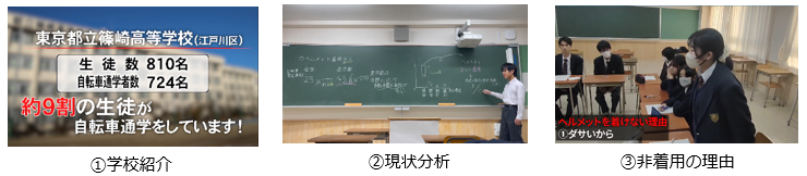 約9割の生徒が自転車通学をしている都立篠崎高校は、生徒が主体となりヘルメット着用の重要性について普及啓発動画を作成しました。高校生ならではの視点で作成された動画は「GRAND CYCLE TOKYO STADIUM FESTA」で公開され、来場者に「自転車ヘルメット着用の努力義務化」というテーマについて考えるきっかけを与えました。