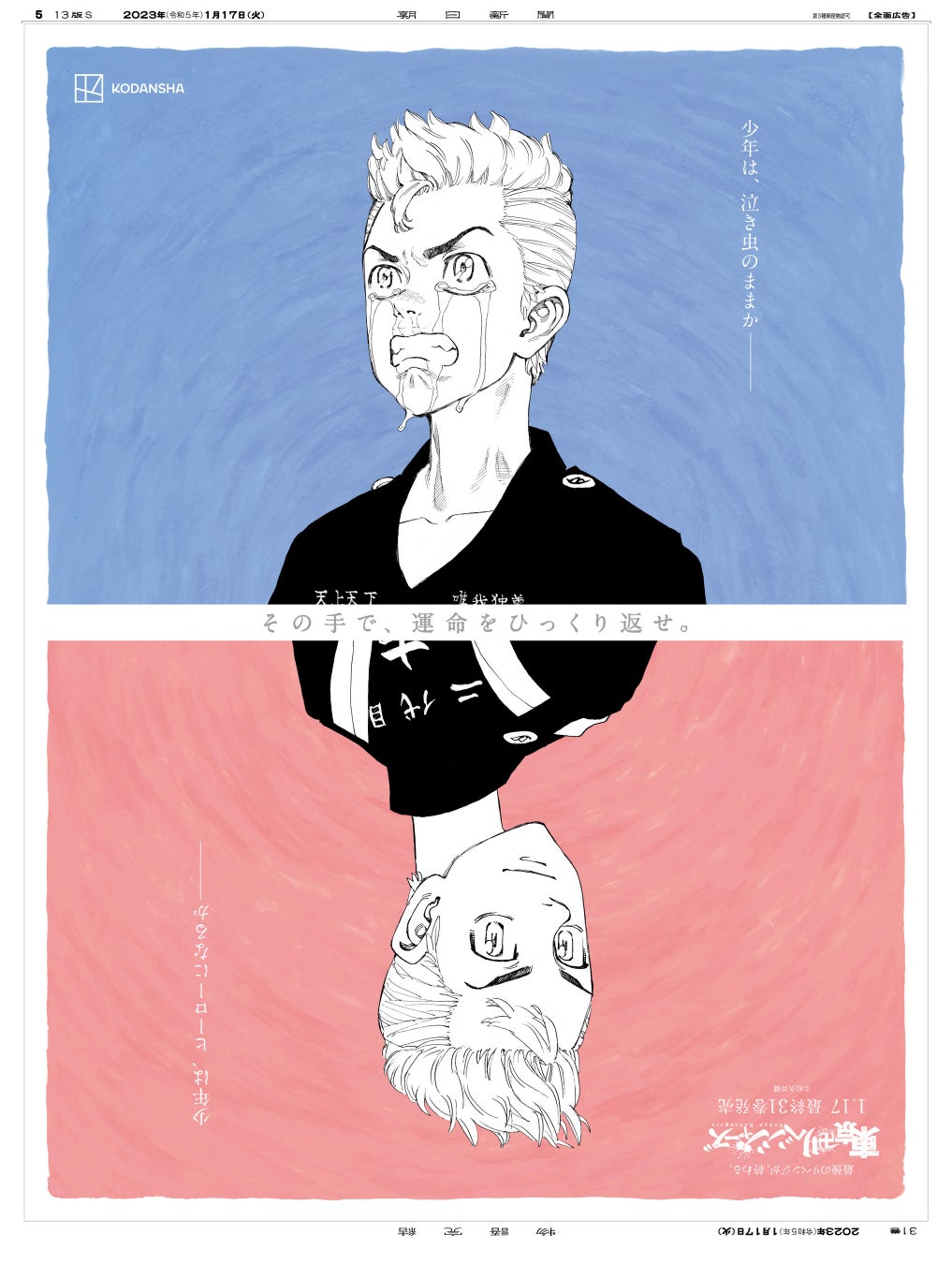 2023年1月17日の朝日新聞朝刊に「運命をひっくり返す」をコンセプトにした『東京卍リベンジャーズ』1面広告が掲載されます!読者は新聞をひっくり返すことでキャラクターの運命をひっくり返せる仕組みです。みんなでひっくり返して同作品の完結を噛み締めましょう!