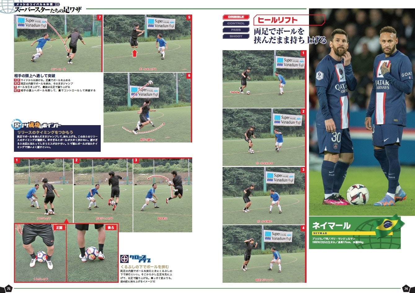 巻頭特集は風間八宏氏によるメッシの技術解説。風間氏が「止める・蹴る・運ぶのすべてが完璧」と語る、メッシのテクニックのすごさを教えます。続く本書のメインコンテンツ「伝説の足ワザ集30」では、若手時代から現在までメッシが見せてきた多数の足ワザから30を厳選し、連続写真でくわしく紐解きます。足ワザのデモンストレーションと解説は、菊原志郎氏と鈴木正治氏が担当しています。