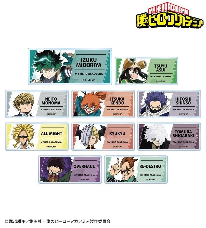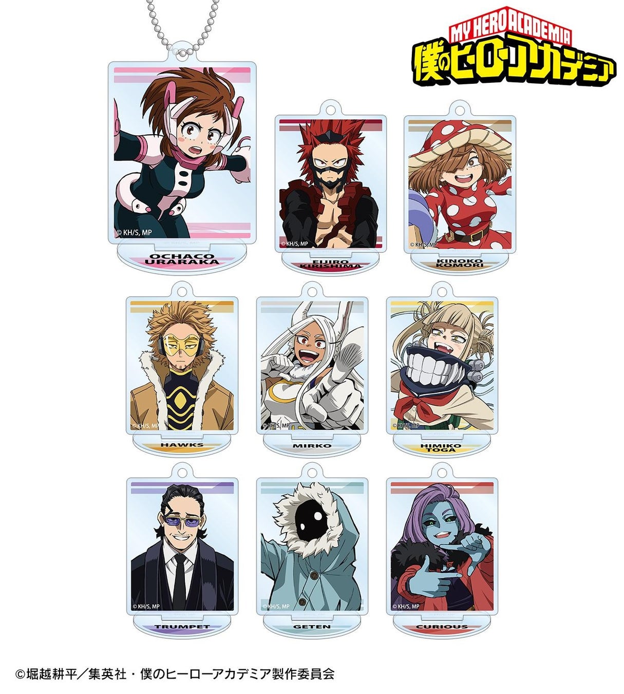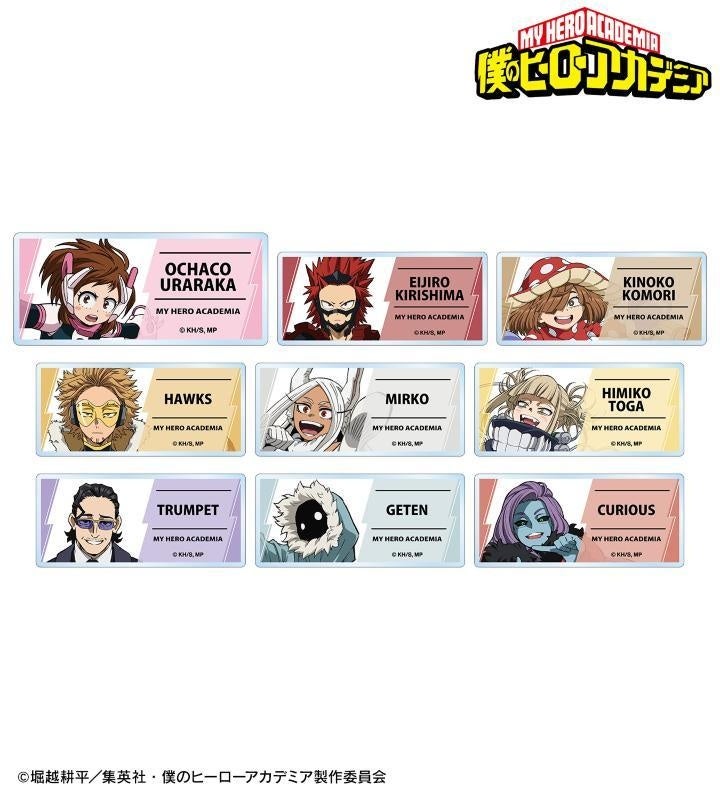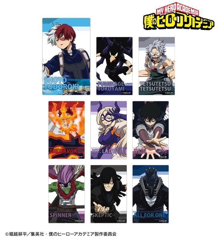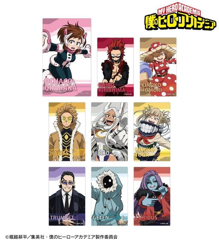 種類 :全38種(緑谷出久、爆豪勝己、麗日お茶子、飯田天哉、轟焦凍、蛙吹梅雨、切島鋭児郎、常闇踏陰、物間寧人、拳藤一佳、鉄哲徹鐵、塩崎茨、小森希乃子、角取ポニー、心操人使、オールマイト、イレイザーヘッド、プレゼント・マイク、ミッドナイト、エンデヴァー、ホークス、ミルコ、Mt.レディ、ファットガム、リューキュウ、死柄木弔、荼毘、トガヒミコ、トゥワイス、スピナー、Mr. コンプレス、リ・デストロ、スケプティック、トランペット、外典、オール・フォー・ワン、キュリオス、オーバーホール)