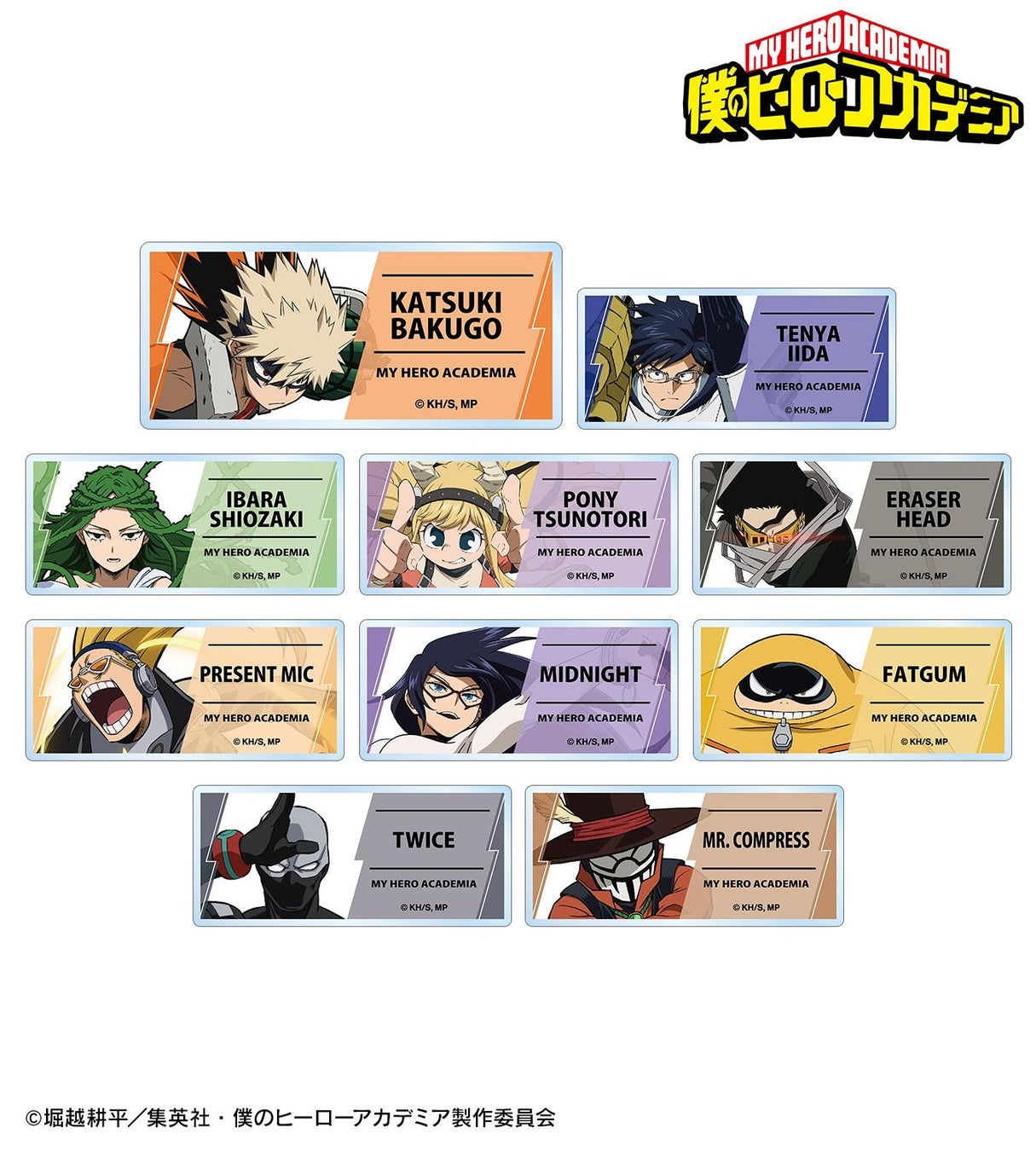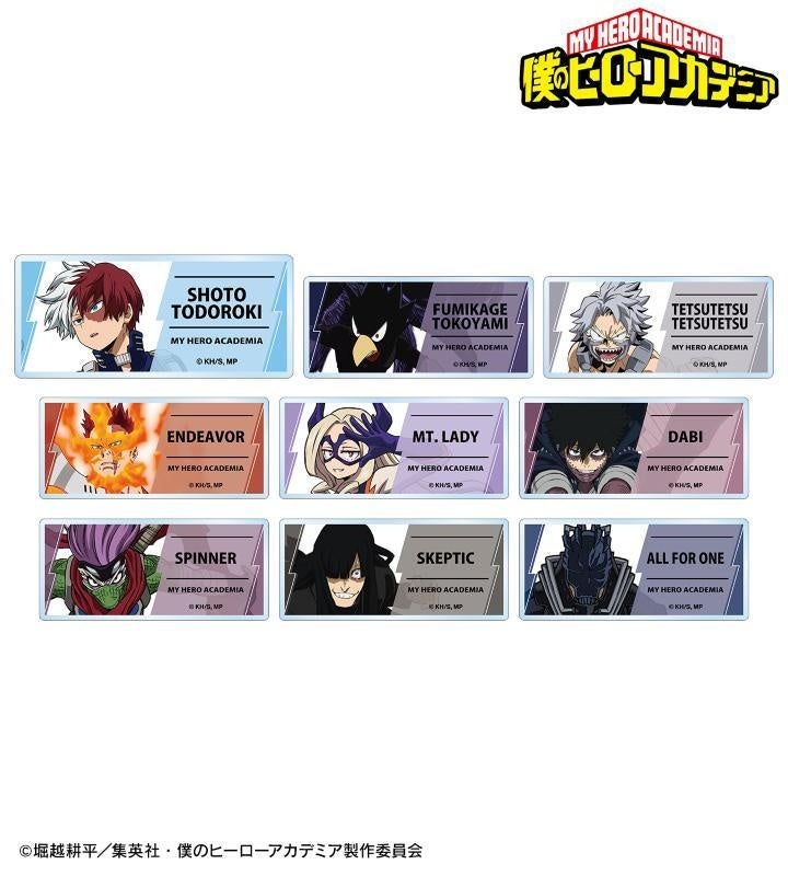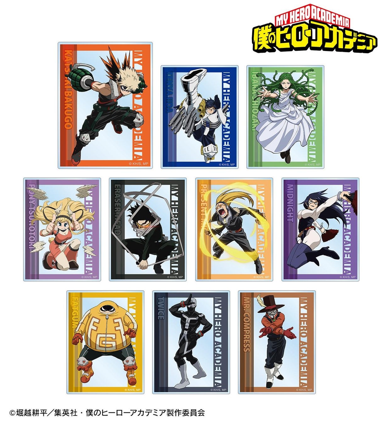 種類 :全38種(緑谷出久、爆豪勝己、麗日お茶子、飯田天哉、轟焦凍、蛙吹梅雨、切島鋭児郎、常闇踏陰、物間寧人、拳藤一佳、鉄哲徹鐵、塩崎茨、小森希乃子、角取ポニー、心操人使、オールマイト、イレイザーヘッド、プレゼント・マイク、ミッドナイト、エンデヴァー、ホークス、ミルコ、Mt.レディ、ファットガム、リューキュウ、死柄木弔、荼毘、トガヒミコ、トゥワイス、スピナー、Mr. コンプレス、リ・デストロ、スケプティック、トランペット、外典、オール・フォー・ワン、キュリオス、オーバーホール)