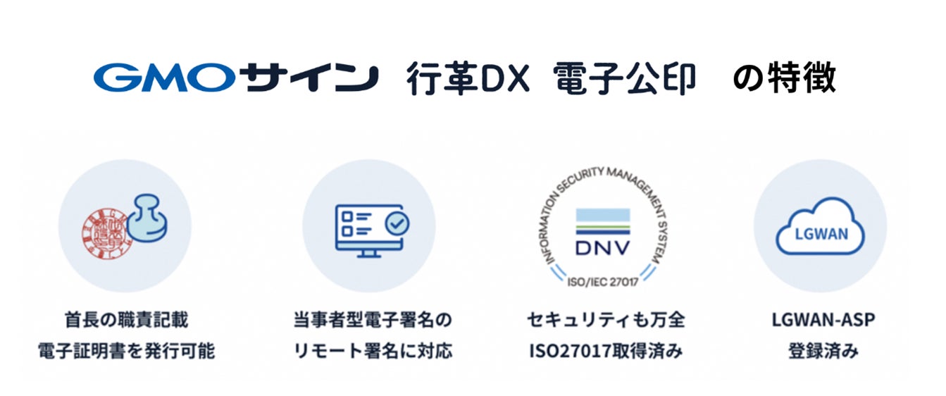「GMOサイン行革DX 電子公印」は、既に大阪府等の複数の自治体で導入実績があり(※1)、デジタル庁が提唱するなりすまし、文書改ざん等のリスクを未然に防ぐための処分通知等の電子化に関するガイドラインにも準拠しています。(※2)LGWAN環境にも対応し、安全且つ利便性の高い業界唯一の電子公印サービスであることが評価され、「公開羅針盤V4」の連携サービスとして選ばれました。