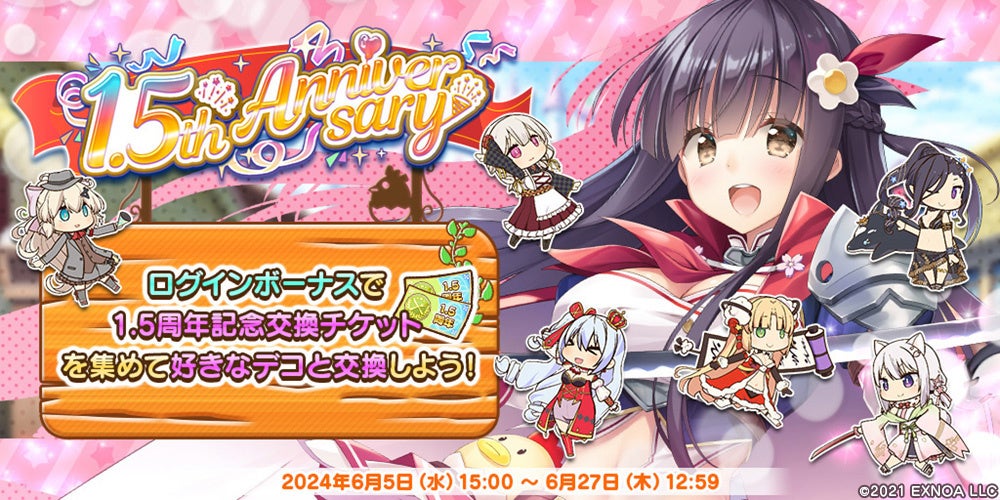 ログインボーナスでもらえる「1.5周年記念チケット」を集めると、1.5周年記念チケット交換所で好きなデコと交換できます。欲しかったデコをこの機会に手に入れましょう!