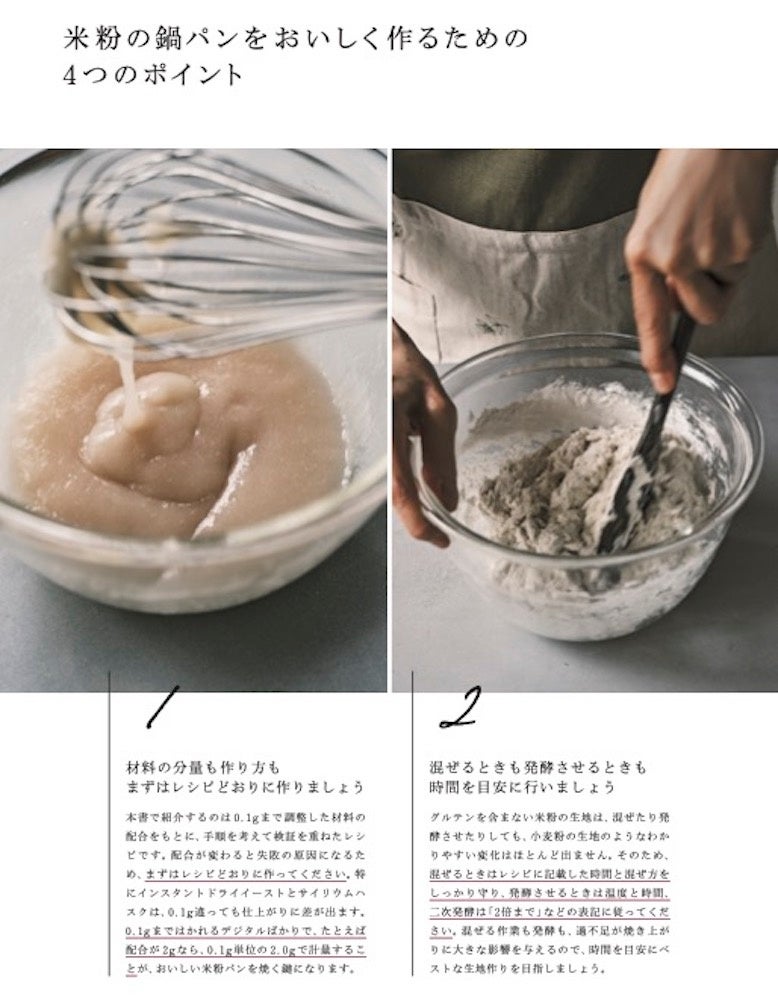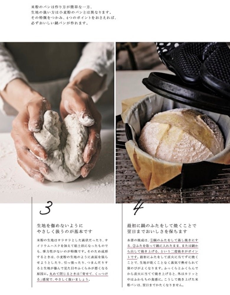 まずは材料・作り方に忠実に、手順どおりに焼いていただければ、これまで食べていた米粉パンよりもずっとおいしく焼けるはず。米粉とストウブ鍋のコラボレーションから生まれる鍋パンのおいしさに一度でもはまったら、もはや鍋でしか米粉パンが焼けなくなってしまうかも?!
