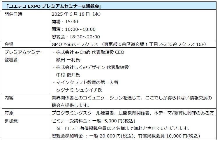 また、最終日の6月18日(水)には、GMO Yours・フクラスにて『コエテコEXPOプレミアムセミナー&懇親会』を開催します。業界関係者が一堂に会し、プレミアムセミナーで得られる情報に加え、リアル開催ならではのコミュニケーションを通じて、ここでしか得られない情報交換の機会を提供します。