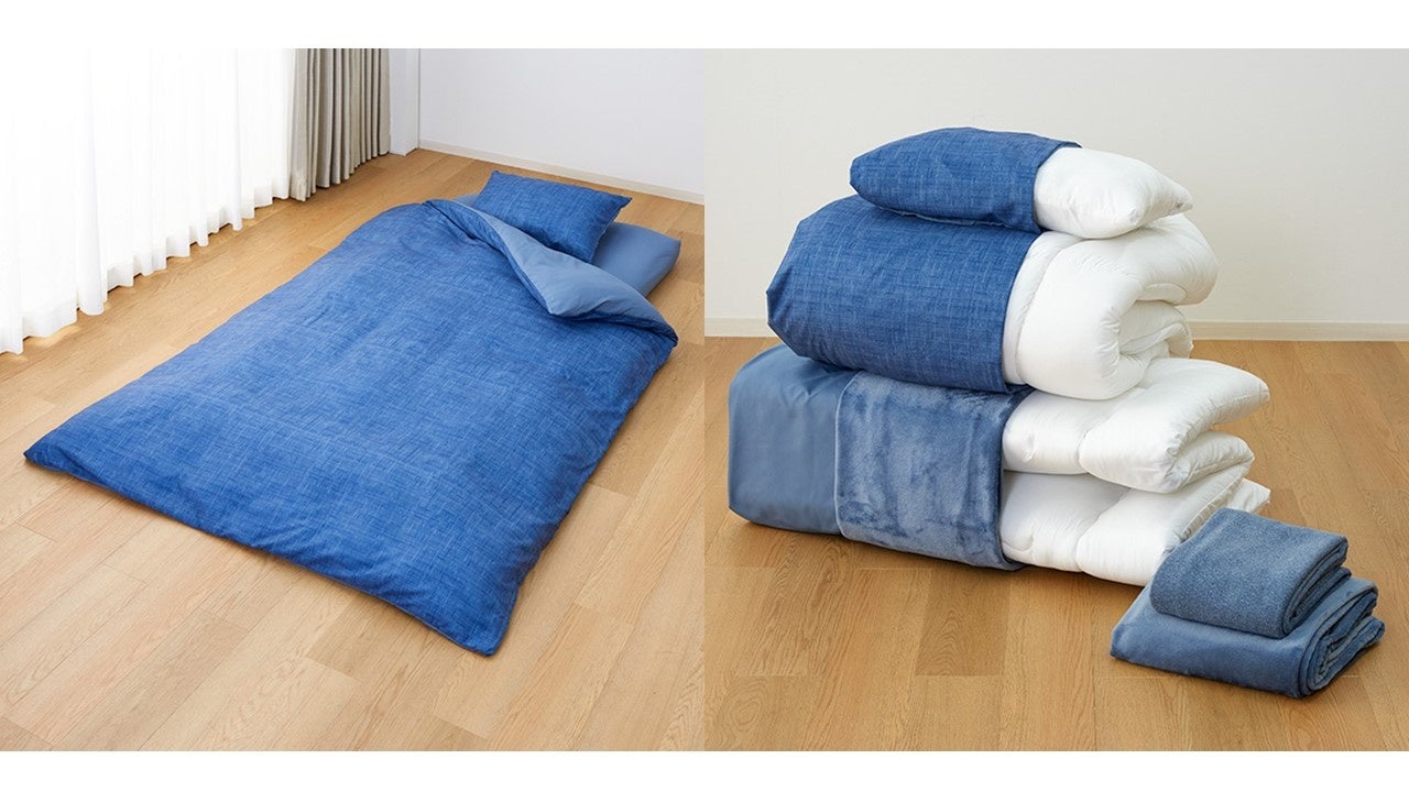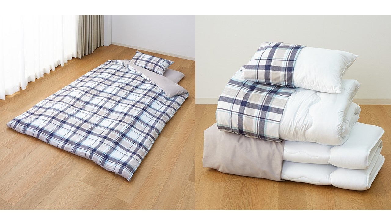必要な寝具が1パックに入った「寝具セット」です。「寝具6点セット」は掛ふとん、敷ふとん、まくらとそれぞれのカバーがセットになっています。掛ふとん、まくらはご家庭で手洗いが可能です。「寝具9点セット」は、さらに毛布、パイルケット、リバーシブルシーツが入っており、年間を通じて使用できるセットです。