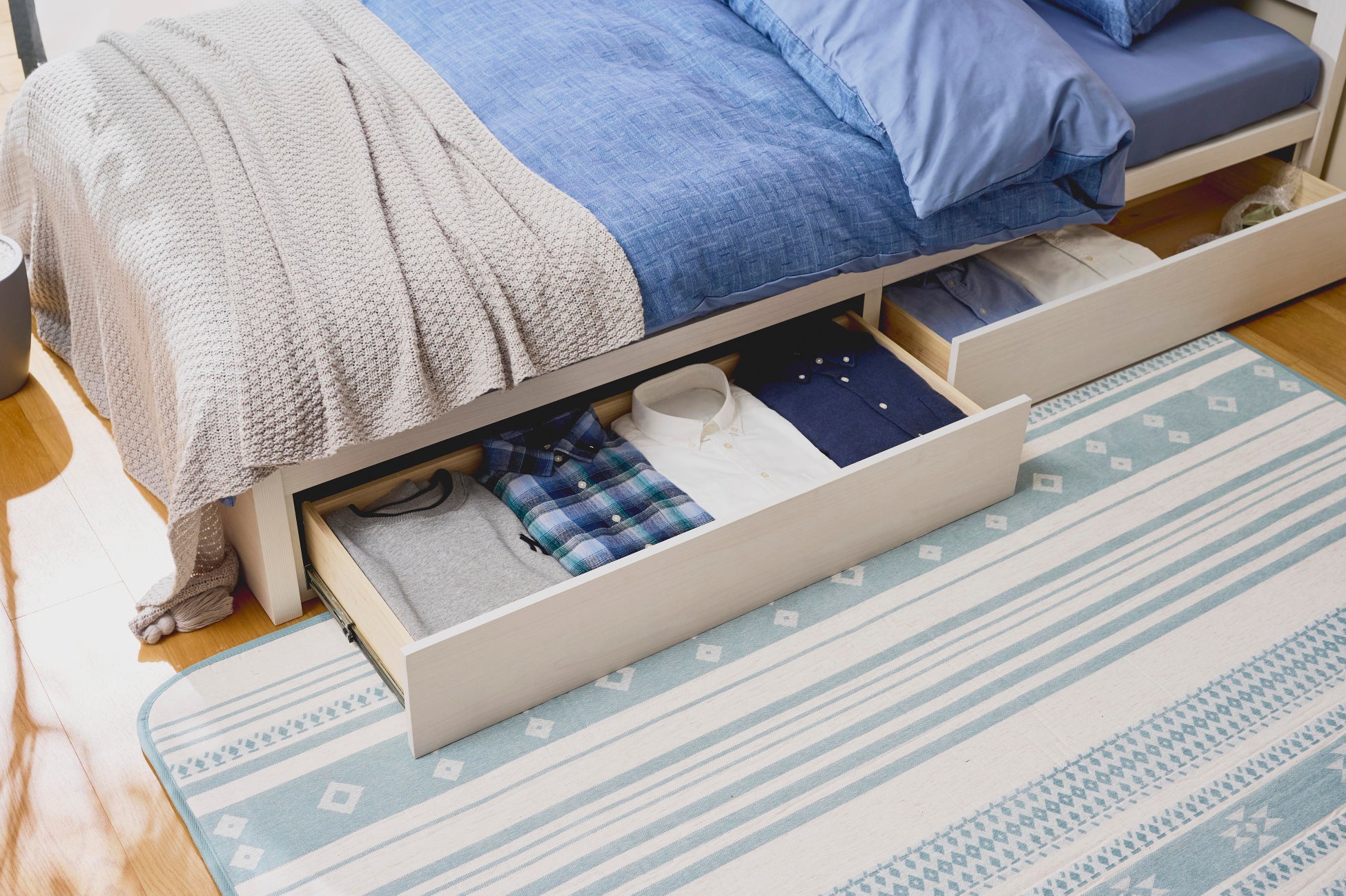 ベッド下に引き出しを付けて、収納スペースを確保した収納引き出しタイプのベッドです。引き出しは、奥まで引き出しやすいフルスライドレールを使用しています。収納庫に衣料やタオルを入れることで、お部屋の収納スペースを拡大できます。また、床板には通気性の良いスノコを使用しています。